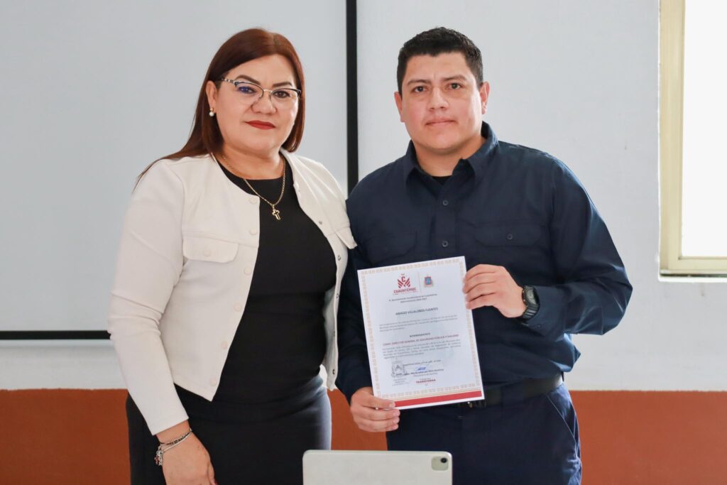 Al finalizar el evento, la alcaldesa entregó un reconocimiento al Teniente Óscar Manuel Cejudo por su desempeño al frente de la Dirección de Seguridad Pública de Cuauhtémoc, deseándole el mayor de los éxitos en sus nuevos proyectos.
