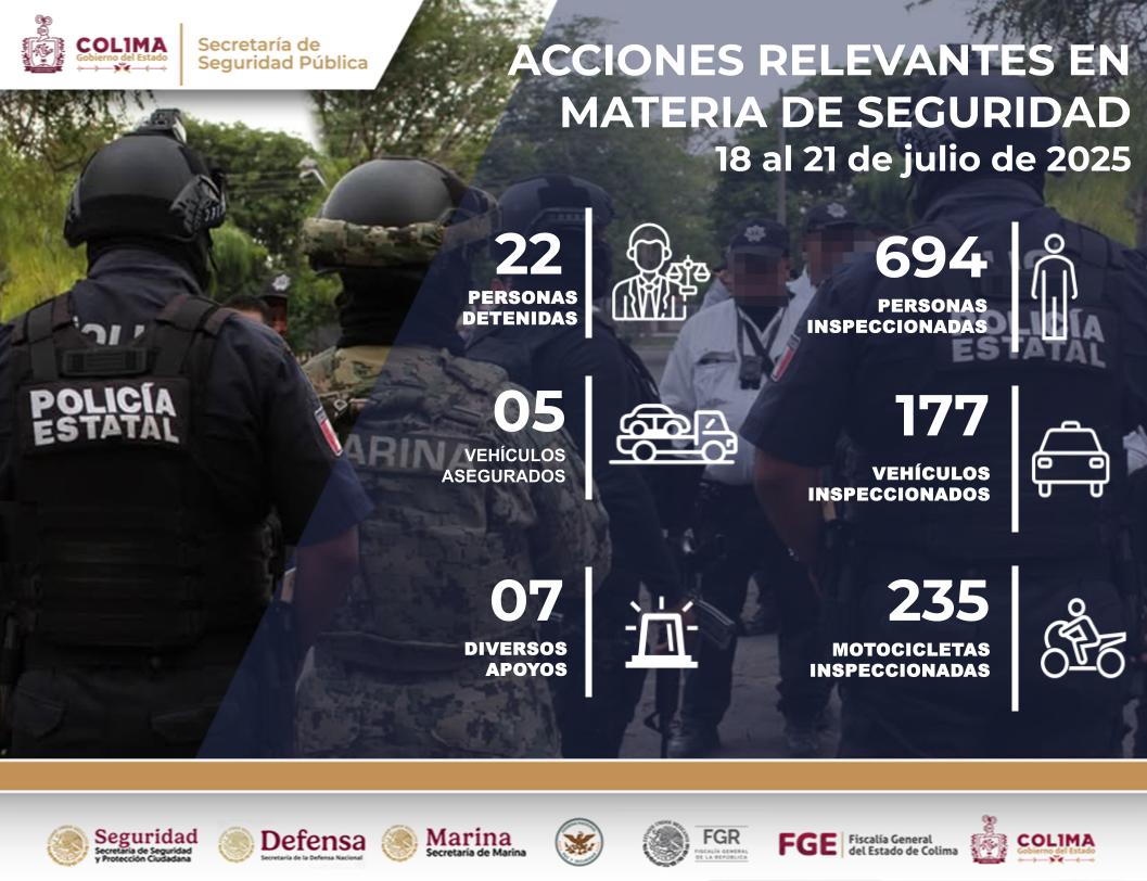 La Secretaría de Seguridad Pública (SSP) del Gobierno del Estado de Colima informa que, durante el pasado fin de semana, la Policía Estatal Preventiva (PEP), con apoyo de personal operativo de la Secretaría de Marina Armada de México (Semar), logró la detención de 22 personas -20 hombres y 2 mujeres- por su presunta participación en delitos contra la salud, violencia familiar, tentativa de robo y diversas faltas administrativas.