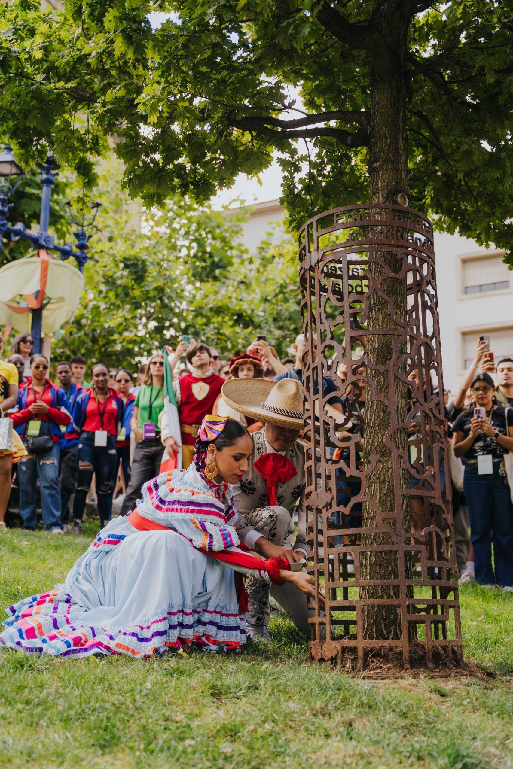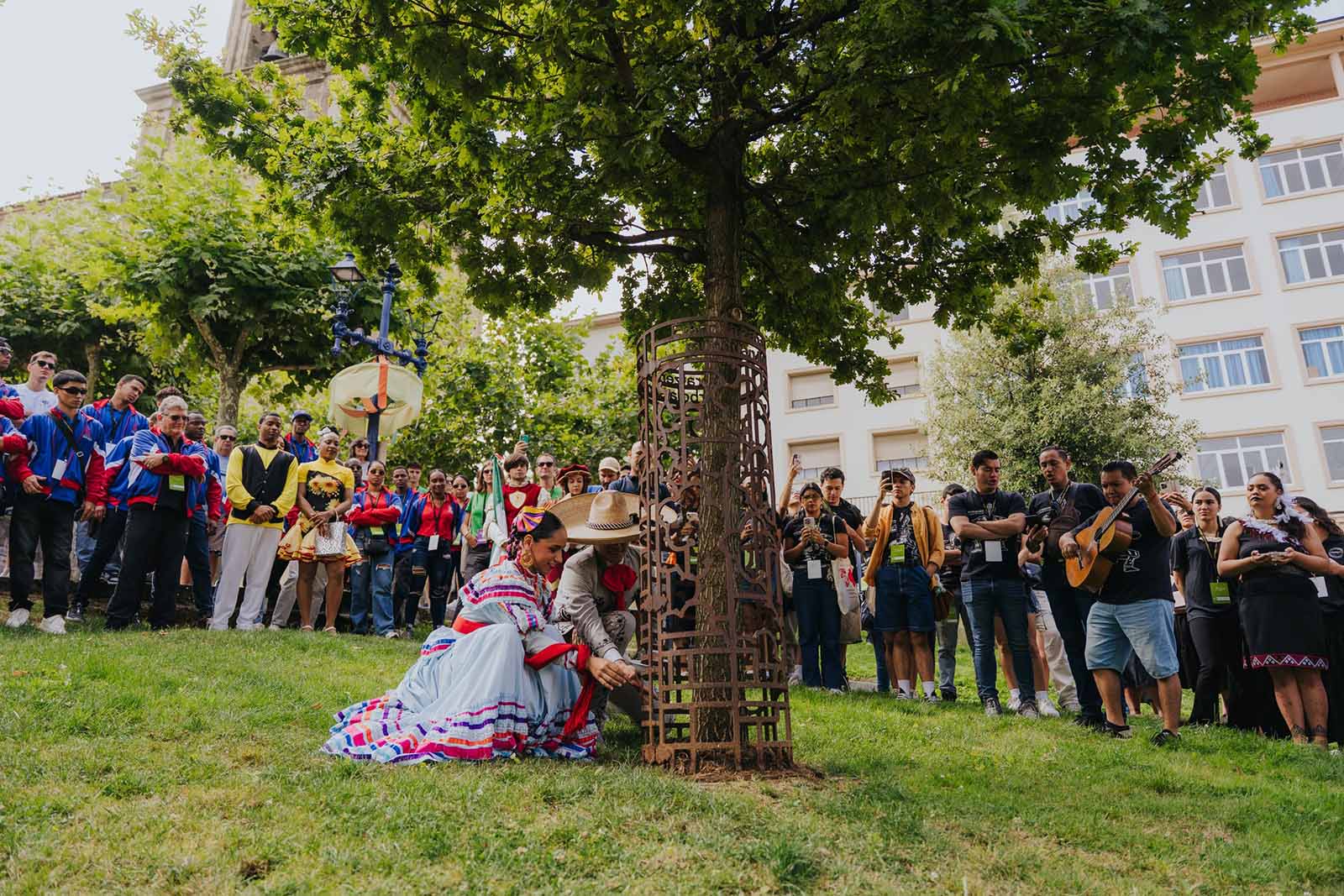 Con una emotiva participación en la ceremonia “Munduko Sustraiak” (Raíces del Mundo), el Ballet Folklórico de la Universidad de Colima dejó su huella en la 50ª edición del Festival Internacional Nazioarteko Folklore Jaialdia, en Portugalete, País Vasco, España. Esta ceremonia, celebrada cada 25 de julio, es uno de los actos más simbólicos del festival, donde los grupos participantes depositan tierra de sus países en las raíces del retoño del árbol de Gernika, como ofrenda de hermandad y respeto entre culturas.