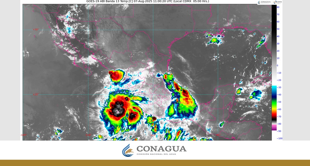 El Servicio Meteorológico Nacional (SMN) pronosticó para este jueves 7 de agosto de 2025 que la tormenta tropical “Ivo” se desplazará frente a las costas del Pacífico central mexicano; sus desprendimientos nubosos ocasionarán lluvias intensas en Nayarit y Jalisco; y puntuales muy fuertes en Colima y Michoacán.