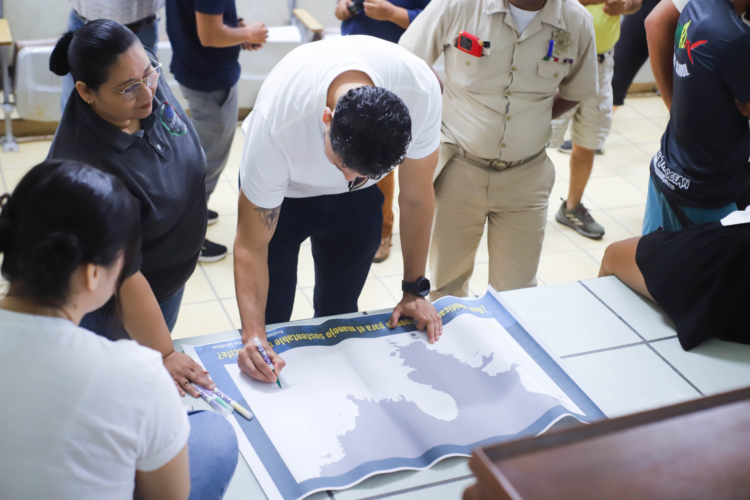 En una segunda sesión, los participantes trabajaron en equipos para realizar una zonificación de la Bahía de Carrizales. Aprovechando su experiencia, dividieron la bahía en diversas zonas con restricciones específicas, asignando áreas para buceo, anclaje de embarcaciones, deportes acuáticos y zonas limitadas para proteger la flora y fauna locales.