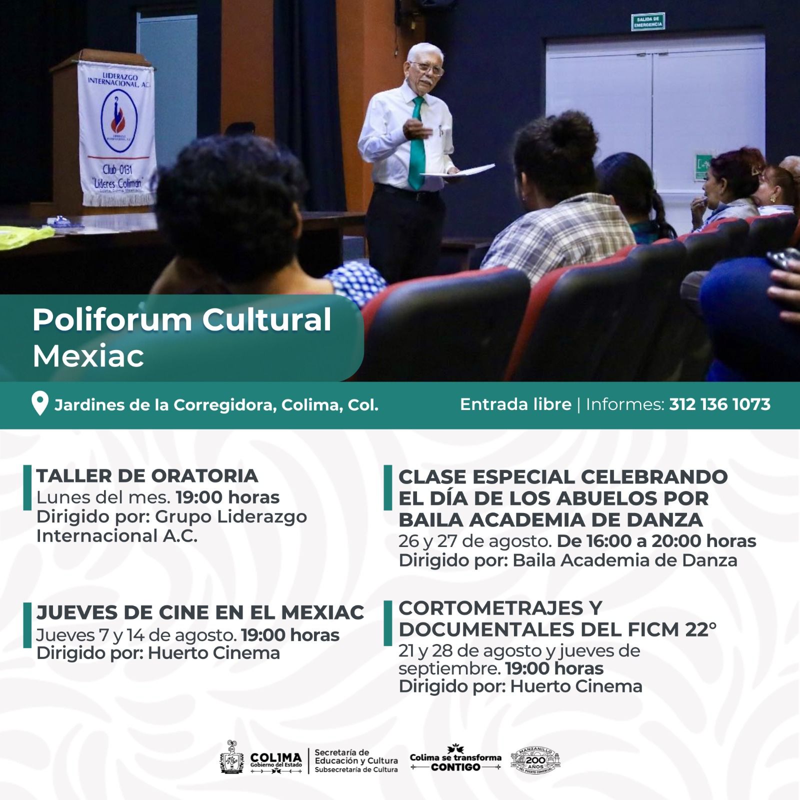 La Subsecretaría de Cultura del Gobierno del Estado de Colima publica su agenda del mes de agosto, con más de 60 actividades artísticas, entre talleres para todo público, cursos de verano, funciones de teatro, conferencias, charlas y proyecciones de cine.