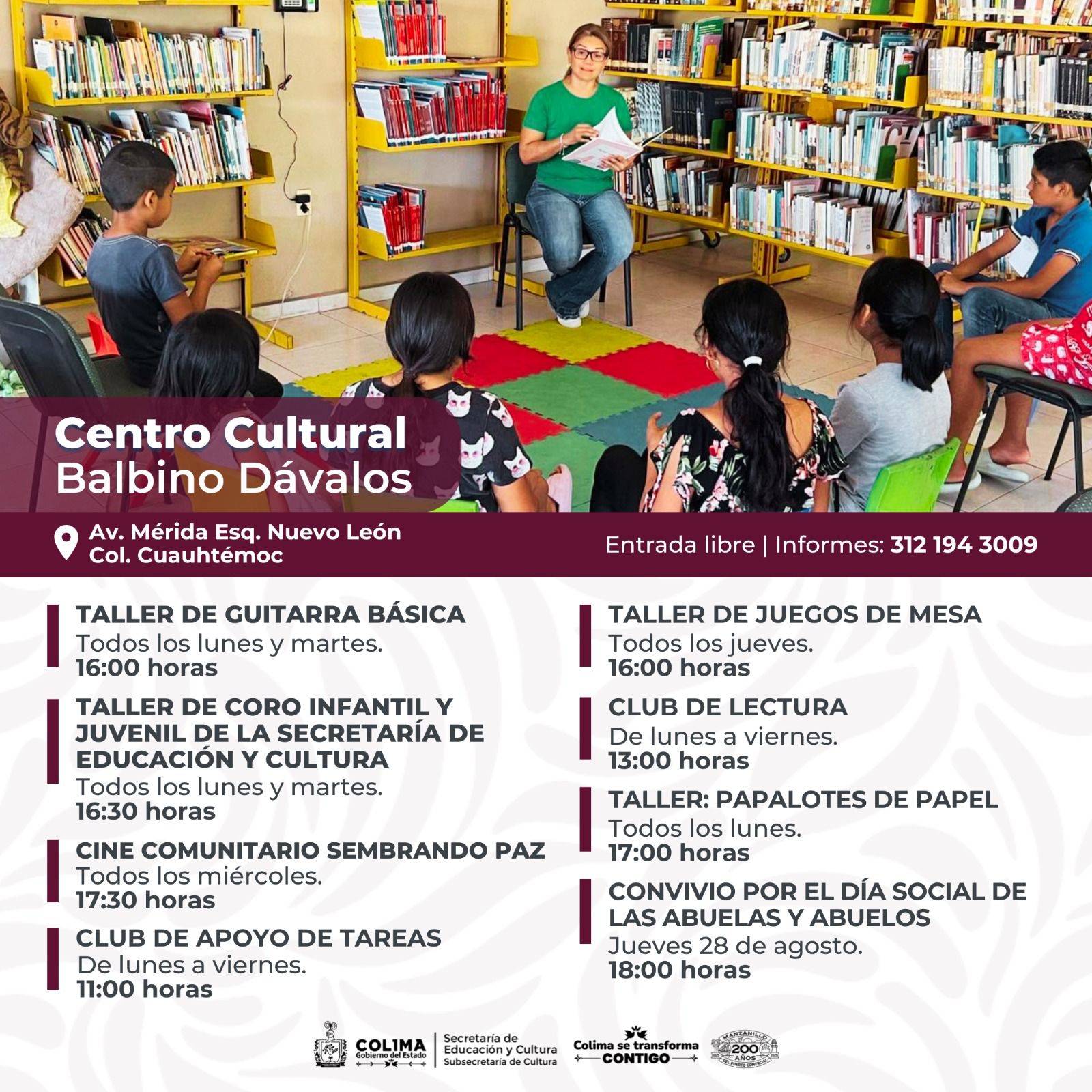 La agenda cultural mensual también ofrece a las familias colimenses una variada oferta de talleres gratuitos de lunes a sábado en diferentes sedes, entre ellas la Fábrica de Innovación Creativa El Tívoli, el Vagón de las Artes, el Centro de Cultura Escrita ‘Miguel Ángel Cuervo’, el Centro Cultural ‘Balbino Dávalos’, la Biblioteca Pública Central Estatal ‘Rafaela Suárez’ y el Poliforum Cultural ‘Adolfo Mexiac’.