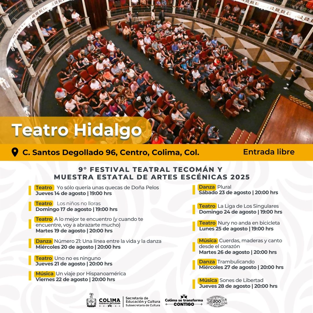 En esta agenda cultural del mes de agosto, destaca la actividad que ofrecerá el Teatro Hidalgo, arrancando con las funciones del 9° Festival Teatro Tecomán que presentará dos puestas en escena en dicho recinto. La primera de ellas el 14 de agosto a las 19:00 horas: ‘Yo sólo quería unas quecas de Doña Pelos’, de la compañía Cardumen Teatro y O.R.V.E. Producciones de la Ciudad de México.
