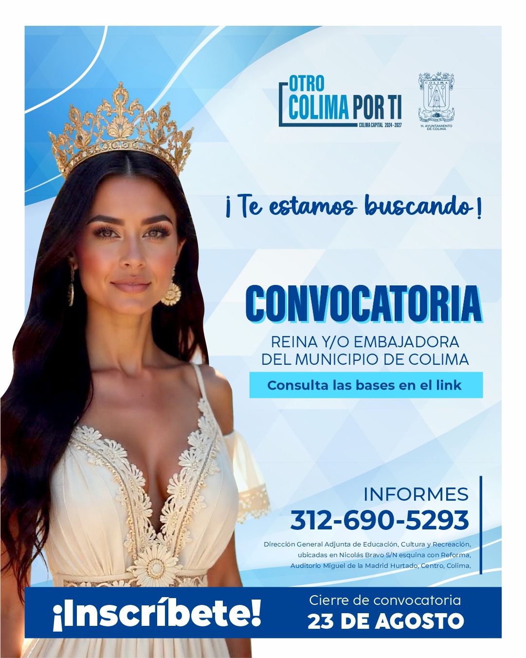 El evento para seleccionar a la Reina y/o embajadora del Municipio de Colima 2025, se llevará a cabo el 28 de agosto del presente año en el patio central del H. Ayuntamiento de Colima a las 19:00 horas.