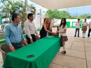 La entrega se realizó en la explanada del Bachillerato 26, donde Martha Angélica Orozco, responsable del MONAE-ABC de la Coordinación de Zona 2, en representación de Guillermo Toscano Reyes, director general del IEEA, agradeció al rector de la UdeC, Christian Torres Ortiz Zermeño, el respaldo a este programa.