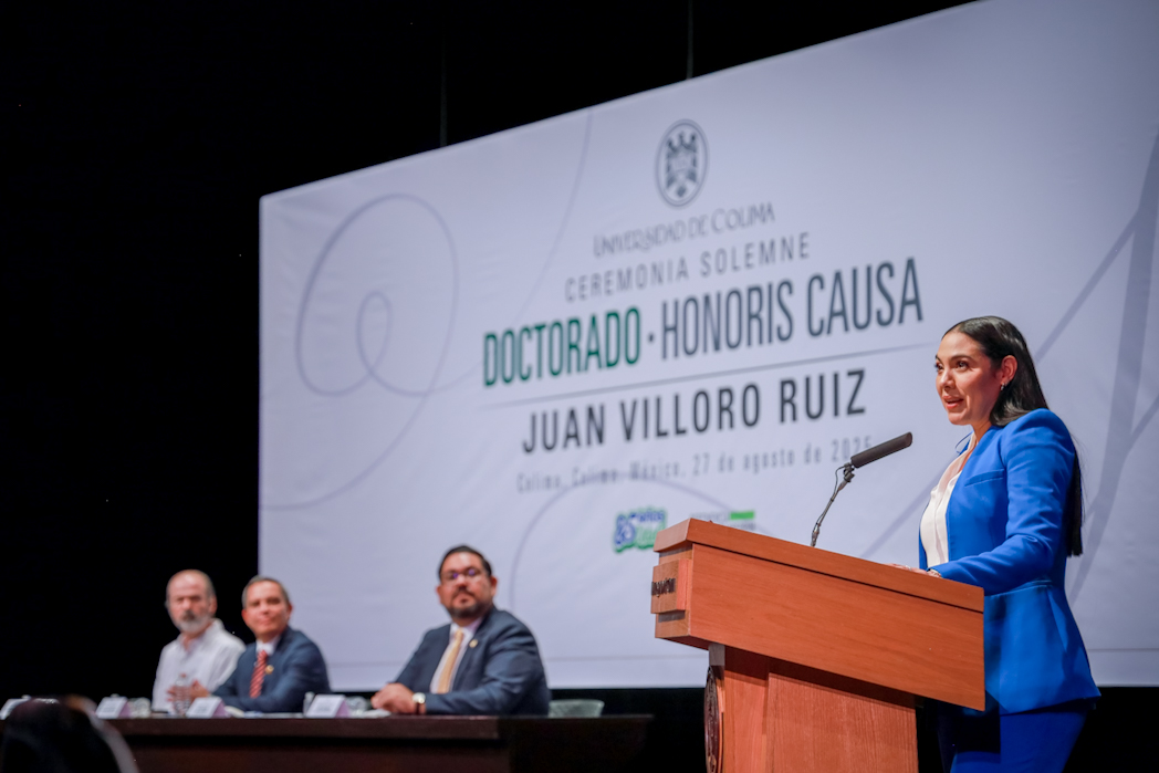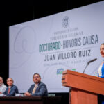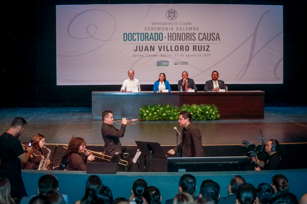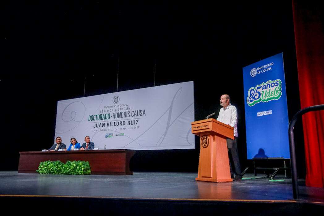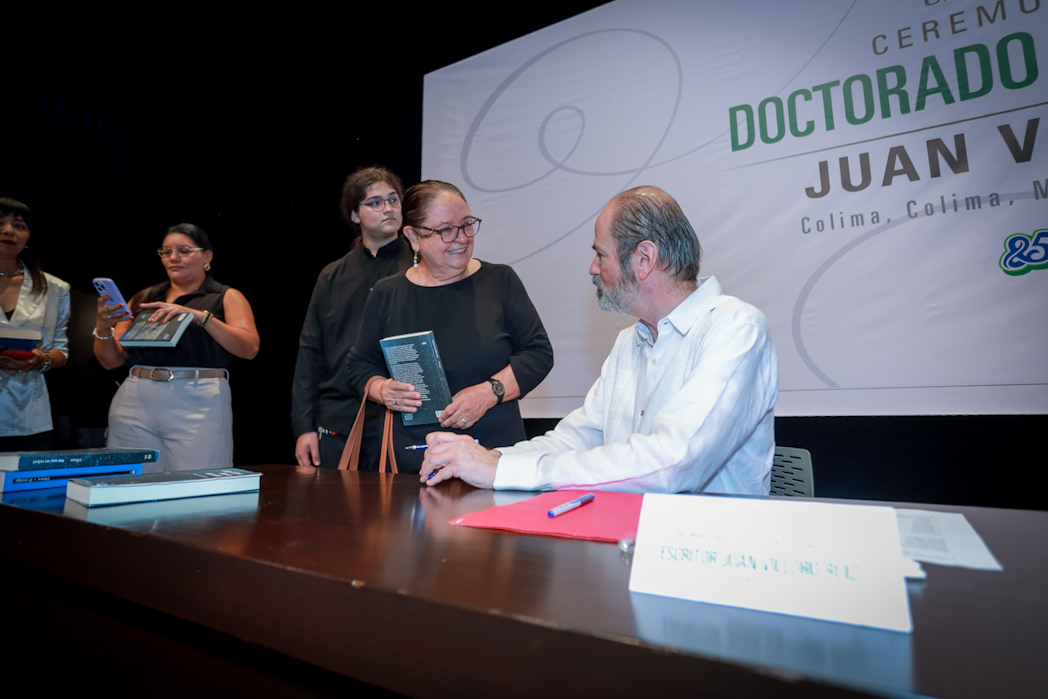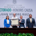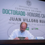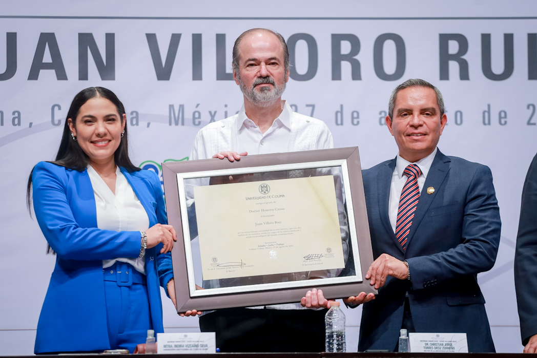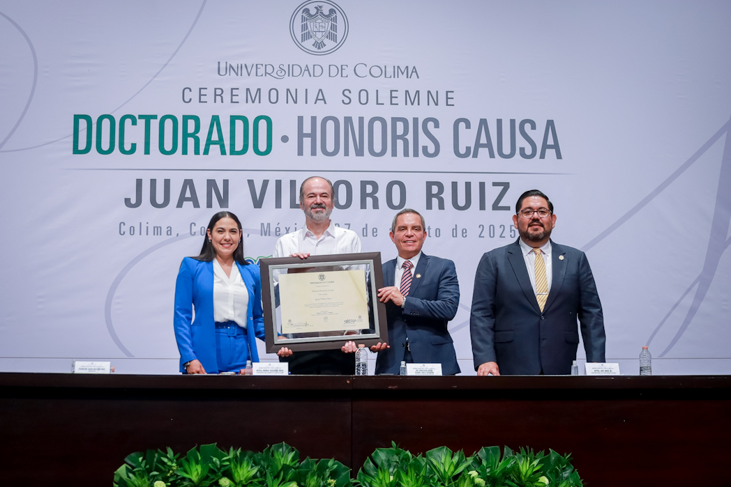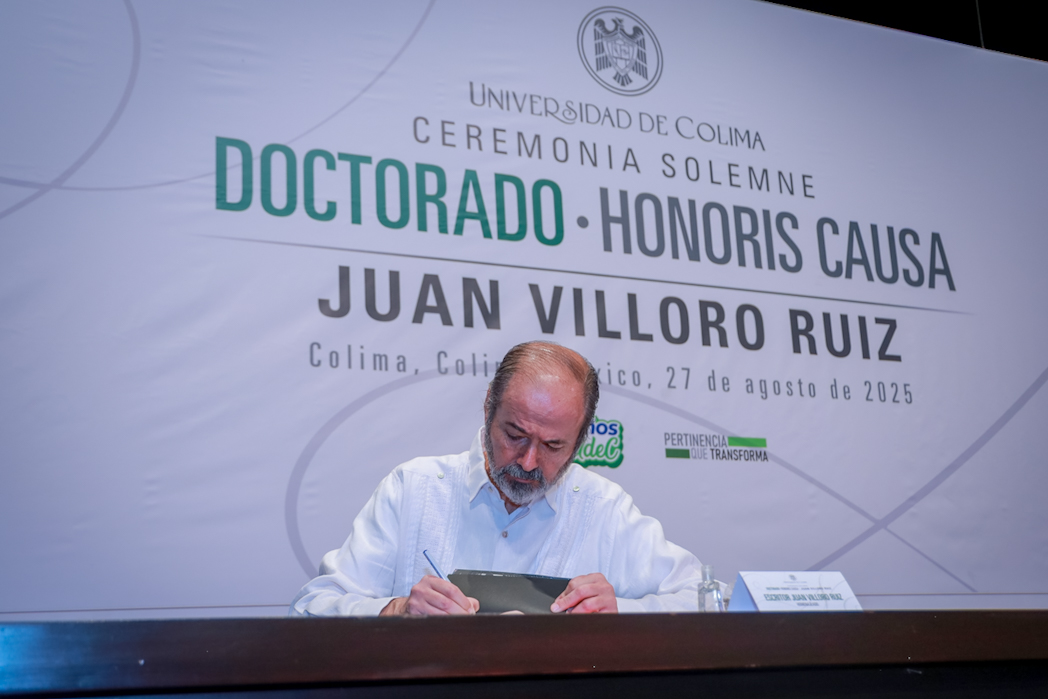 Este miércoles, Christian Jorge Torres Ortiz Zermeño, rector de la Universidad de Colima, entregó en nombre de la comunidad universitaria, el grado de Doctor Honoris causa a Juan Villoro Ruiz, destacado escritor, cronista, ensayista y periodista mexicano, por la extraordinaria versatilidad de su obra literaria, que, dice el Acuerdo, “con alta calidad en su escritura, revela los rasgos de la cultura mexicana y señala los paradigmas del mundo contemporáneo”.