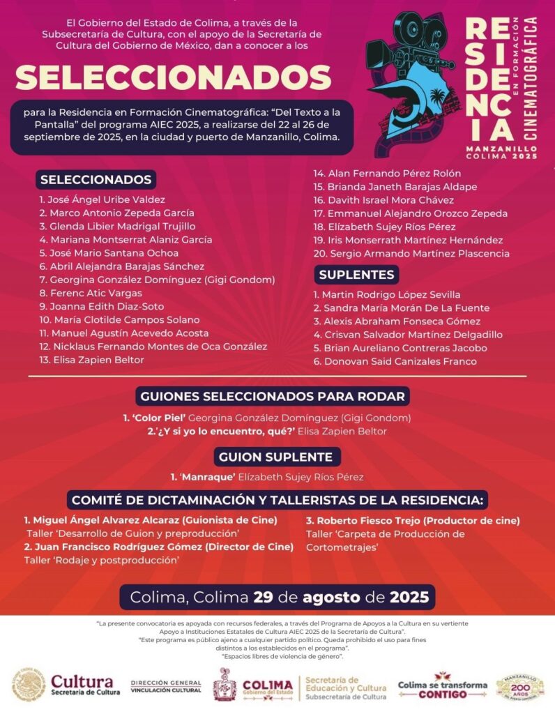 La Subsecretaría de Cultura del Gobierno del Estado de Colima, en coordinación con la Secretaría de Cultura del Gobierno de México, a través del programa federal de Apoyos a Instituciones Estatales de Cultura, publican la lista de personas seleccionadas para integrar la Residencia en Formación Cinematográfica Manzanillo 2025, que se llevará a cabo del 22 al 26 de septiembre próximo.