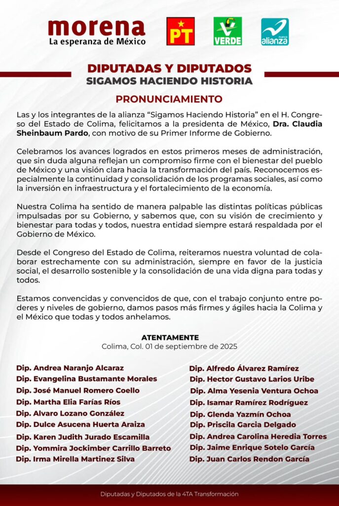 Las y los integrantes de la alianza “Sigamos Haciendo Historia” en el H. Congreso del Estado de Colima, felicitamos a la presidenta de México, Dra. Claudia Sheinbaum Pardo, con motivo de su Primer Informe de Gobierno.