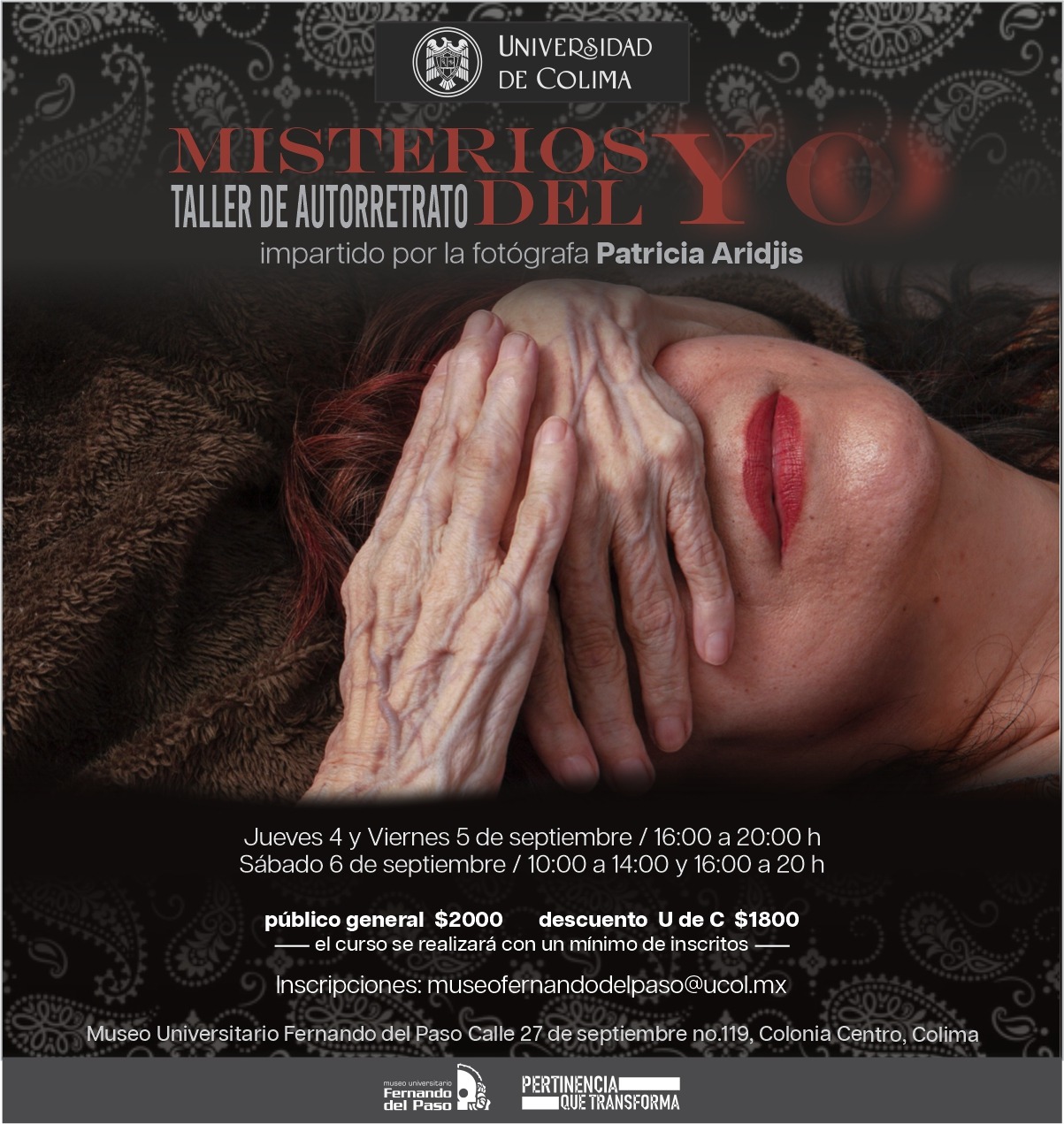 Con el objetivo de darle un buen cierre a la exitosa y propositiva exposición “Mujeres de peso”, de la artista mexicana Patricia Aridjis, el Museo Universitario Fernando del Paso de la Universidad de Colima invita a participar en el taller de autorretrato “Misterios del yo”, que esta destacada fotógrafa impartirá de manera presencial del 4 al 6 de septiembre.