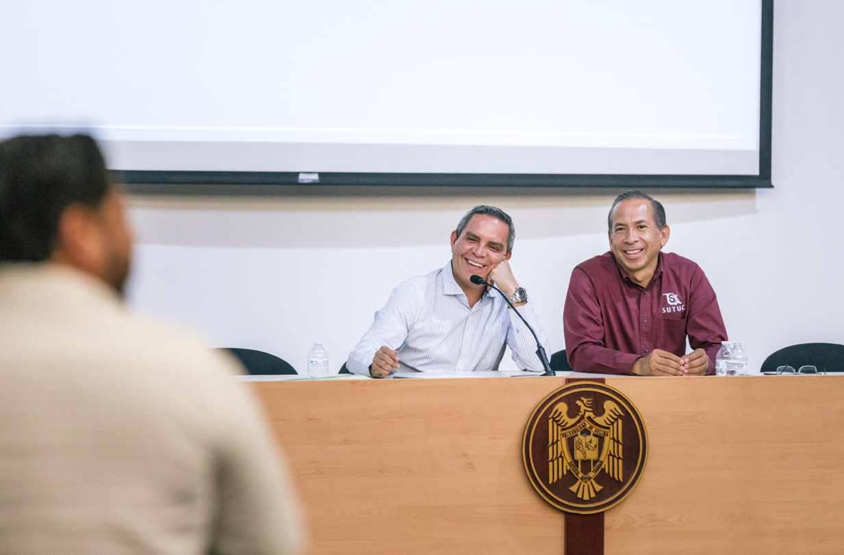 En un ambiente de diálogo respetuoso y unidad institucional, se llevó a cabo la tarde de este martes un encuentro entre el rector de la Universidad de Colima, Dr. Christian Jorge Torres Ortiz Zermeño, y el Comité Ejecutivo Central del Sindicato Único de Trabajadores de la UdeC (SUTUC), encabezado por su secretario general, Luis Enrique Zamorano Manríquez. La reunión se realizó en el auditorio de la Facultad de Ciencias Políticas y Sociales del campus Norte.
