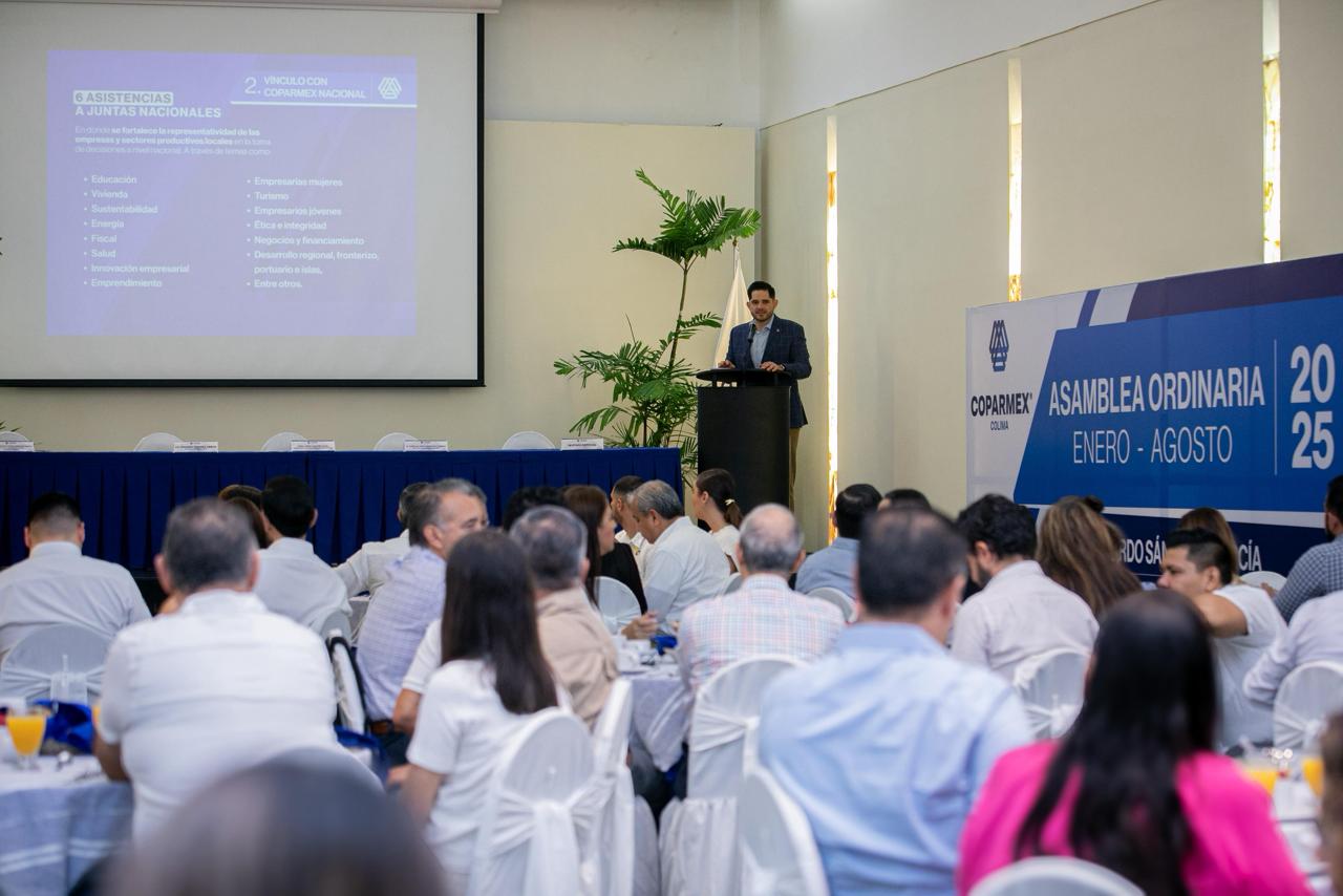 La gobernadora Indira Vizcaíno Silva participó la mañana de este viernes en la asamblea ordinaria de la Confederación Patronal de la República Mexicana (Coparmex) en Colima, por invitación de su presidente estatal, Eduardo Sánchez García, quien presentó su informe de actividades del periodo enero-agosto 2025 y entregó diversos reconocimientos a personas agremiadas.