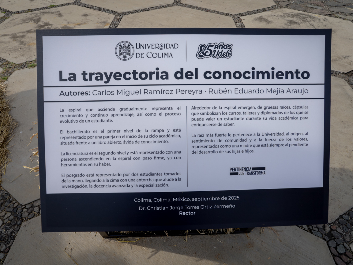 Como parte de los eventos conmemorativos por el 85 aniversario de nuestra Casa de Estudios, la mañana de este lunes, Christian Jorge Torres Ortiz Zermeño, rector de la Universidad de Colima, develó la escultura titulada: “La trayectoria del conocimiento”, en una ceremonia realizada en la explanada del Paraninfo Universitario y a la que acudieron estudiantes, trabajadores y directivos de la institución.