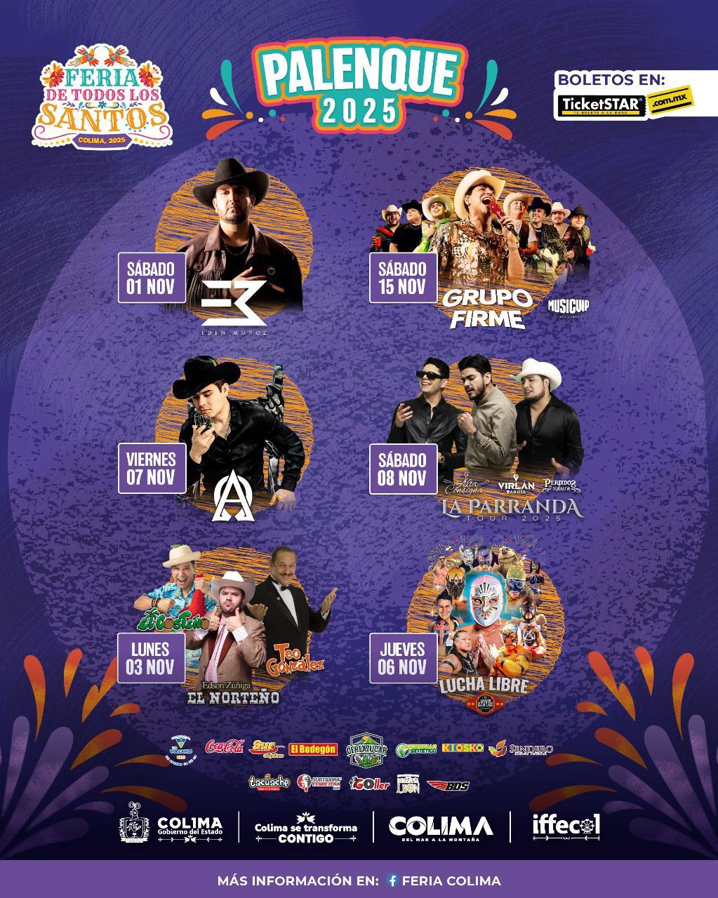 Rodolfo Aguilar informó que este año en el Palenque se presentarán Edén Muñoz el sábado 1 de noviembre; Teo González, Edson Zúñiga ‘El Norteño y ‘El Costeño’ el lunes 3 de noviembre; una función del Consejo Mundial de la Lucha Libre (CMLL) encabezada por ‘Místico’ el jueves 6; Alfredo Olivas el viernes 7; Alta Consigna, Virlán García y Perdidos de Sinaloa con ‘La Parranda Tour’ el sábado 8 y finalmente Grupo Firme el sábado 15 de noviembre.