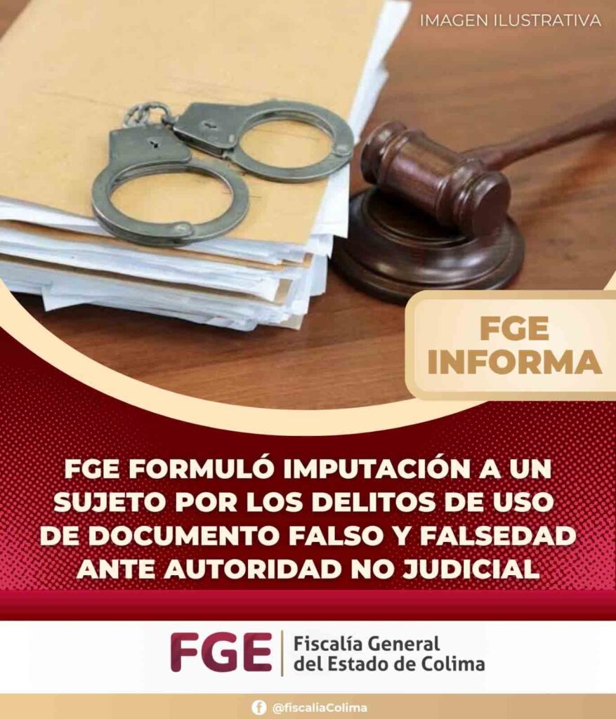La Fiscalía General del Estado (FGE) logró, con base en datos de prueba suficientes, que un Juez de Control vinculara a proceso a Benjamín “N”, por los delitos de uso de documento falso, cometido en agravio de la sociedad, y de falsedad ante autoridad no judicial en agravio del Estado, por hechos relacionados con el Proceso Electoral Local 2023-2024 en Colima, donde buscaba obtener el registro como candidato del partido Movimiento Ciudadano a una diputación local por el principio de representación proporcional.