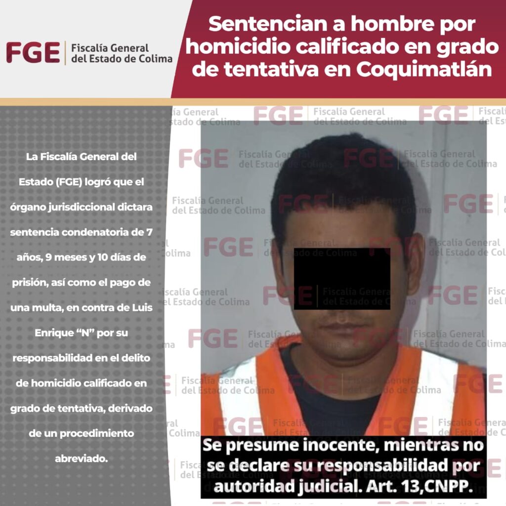 La Fiscalía General del Estado (FGE) logró que el órgano jurisdiccional dictara sentencia condenatoria de 7 años, 9 meses y 10 días de prisión, así como el pago de una multa, en contra de Luis Enrique “N” por su responsabilidad en el delito de homicidio calificado en grado de tentativa, derivado de un procedimiento abreviado.