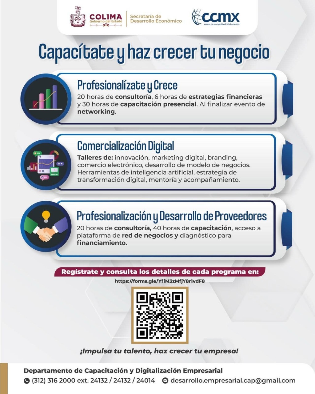 El Gobierno del Estado de Colima, a través de la Secretaría de Desarrollo Económico (Sedeco), con apoyo del Centro de Competitividad de México (CCMX), invita a las empresas colimenses a participar en los programas de capacitación orientados a fortalecer sus capacidades, aumentar su competitividad y generar mayores oportunidades de crecimiento económico en la entidad.