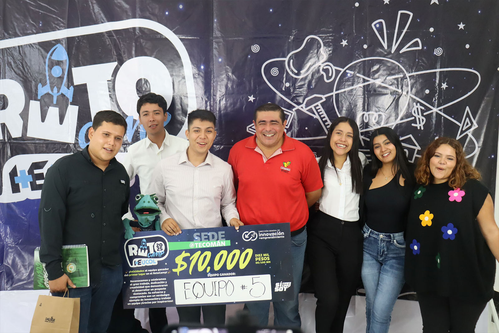 Primer lugar: Equipo 5, integrado por Lorena Aldama Torres (Contabilidad), Jonathan Arandas Rodríguez (Contabilidad), Valeria Vega Maldonado (Veterinaria y Zootecnia), Diego Uriel Vicencio Álvarez (Ciencias Químicas) y Carolina Espino del Castillo Ayala (Veterinaria y Zootecnia).