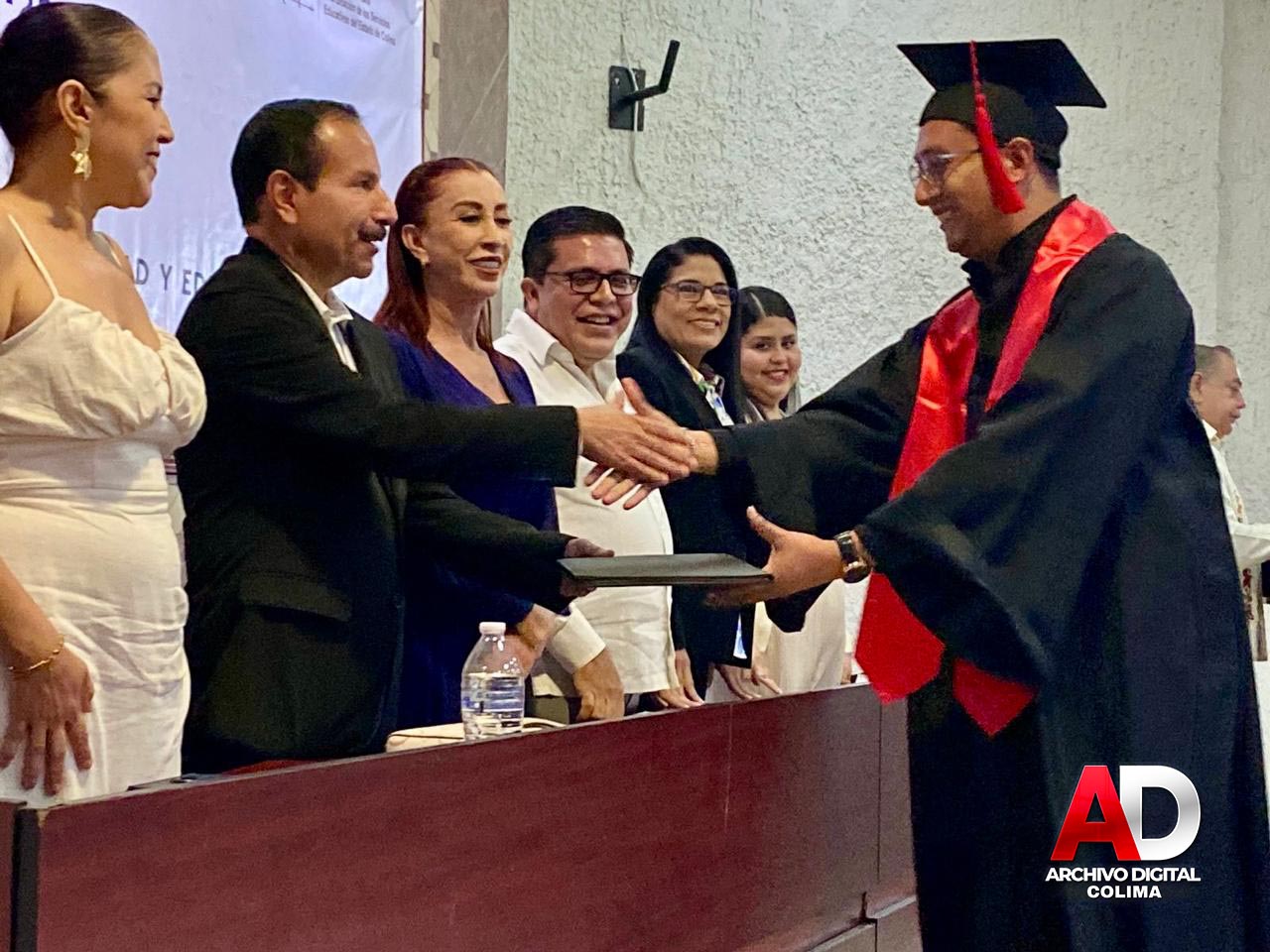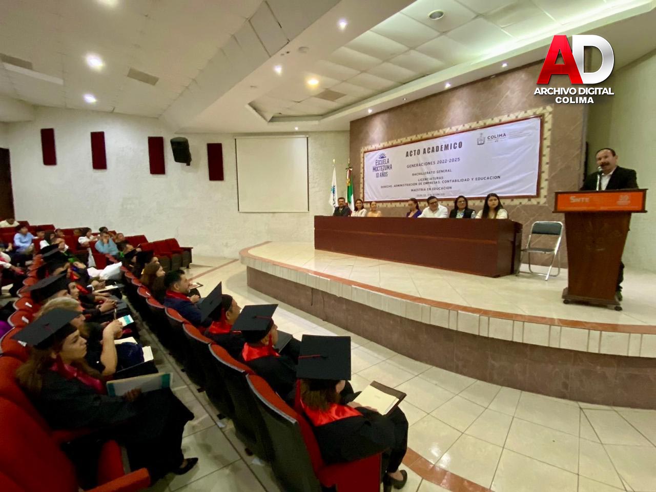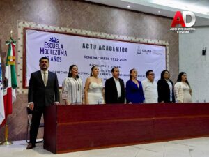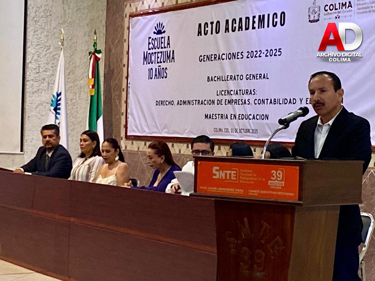 Este fin de semana se llevó a cabo el Acto Académico de Graduación de Escuela Moctezuma, donde se entregaron certificados y títulos a egresados de Bachillerato, Licenciatura y Maestría, quienes concluyeron satisfactoriamente sus estudios y recibieron sus documentos en una emotiva ceremonia, realizada en los espacios del auditorio de la Sección 39 del SNTE, evento que contó con la presencia de la presidenta de Villa de Álvarez, Mtra. Tey Gutiérrez y del Mtro. Federico Rangel Lozano, regidor del H. Ayuntamiento de Colima, en representación del alcalde capitalino, Riult Rivera, como invitados especiales.