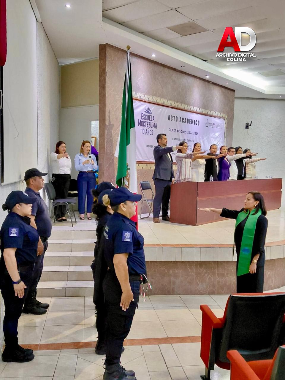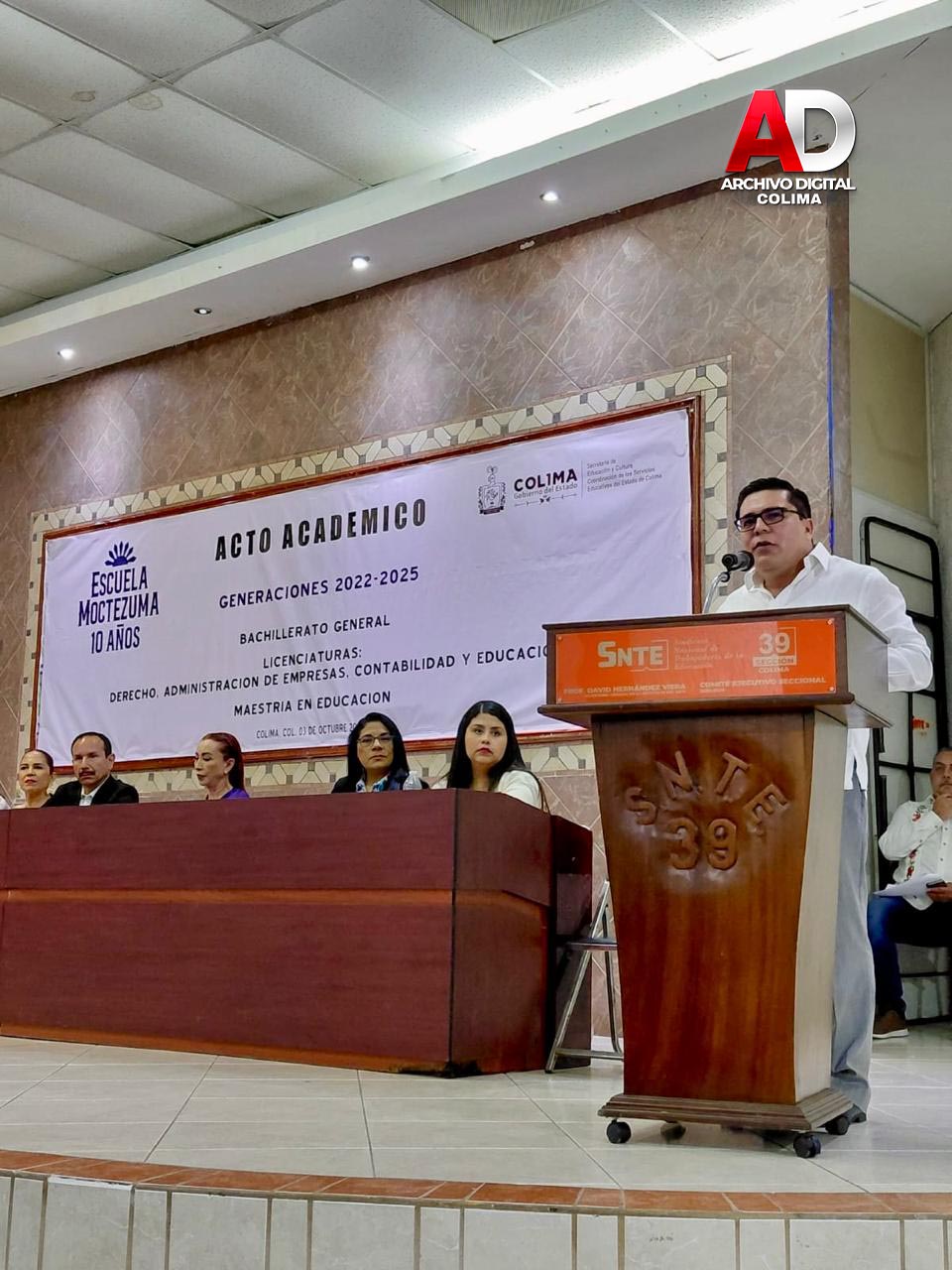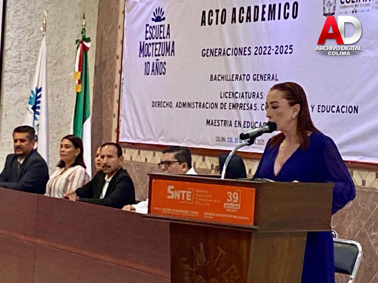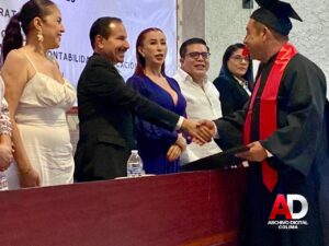Este fin de semana se llevó a cabo el Acto Académico de Graduación de Escuela Moctezuma, donde se entregaron certificados y títulos a egresados de Bachillerato, Licenciatura y Maestría, quienes concluyeron satisfactoriamente sus estudios y recibieron sus documentos en una emotiva ceremonia, realizada en los espacios del auditorio de la Sección 39 del SNTE, evento que contó con la presencia de la presidenta de Villa de Álvarez, Mtra. Tey Gutiérrez y del Mtro. Federico Rangel Lozano, regidor del H. Ayuntamiento de Colima, en representación del alcalde capitalino, Riult Rivera, como invitados especiales.