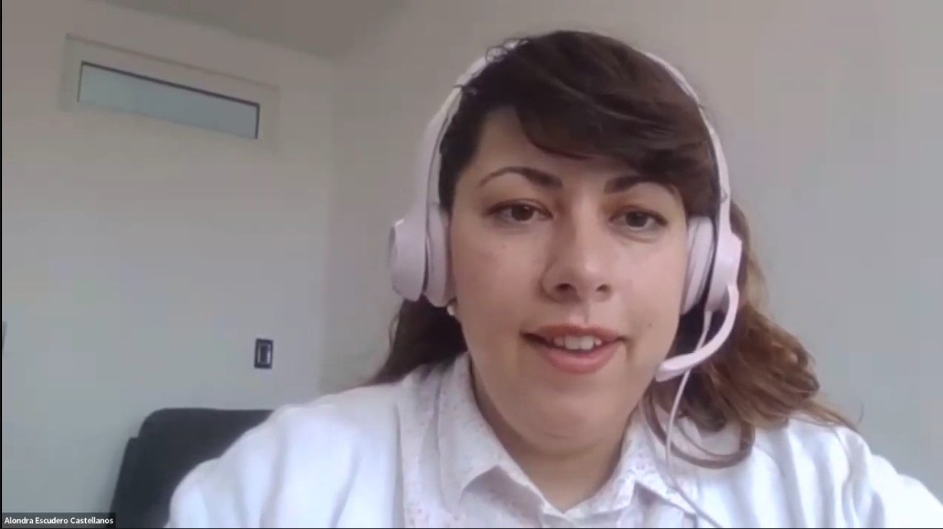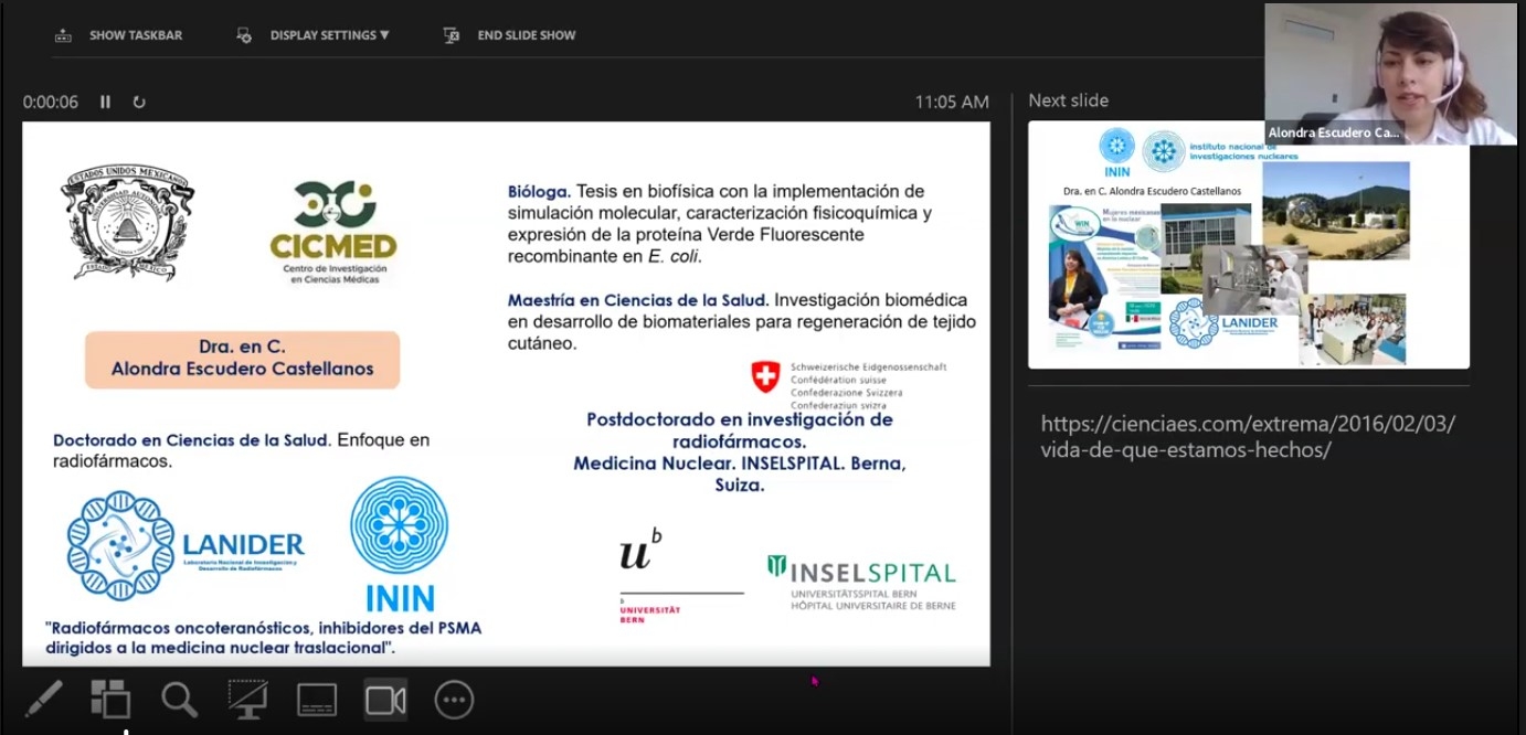 La Dra. Escudero -bióloga mexicana con posgrado en Ciencias de la Salud y doctorado en radiofármacos- compartió parte de su trayectoria académica, que incluye estancias de investigación en el Instituto Nacional de Investigaciones Nucleares (ININ), la Universidad del Estado de México y la Universidad de Berna, Suiza. Actualmente pertenece al Sistema Nacional de Investigadores del CONAHCYT (Nivel Candidato) y se desempeña como profesora a nivel licenciatura.