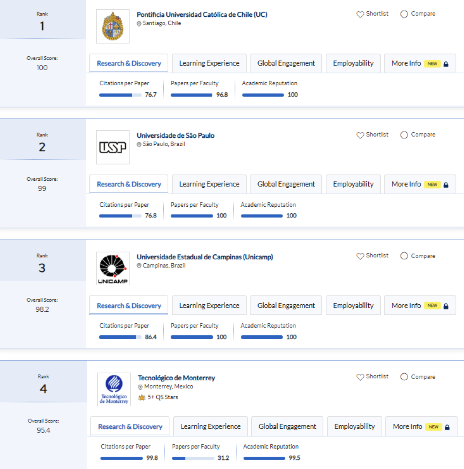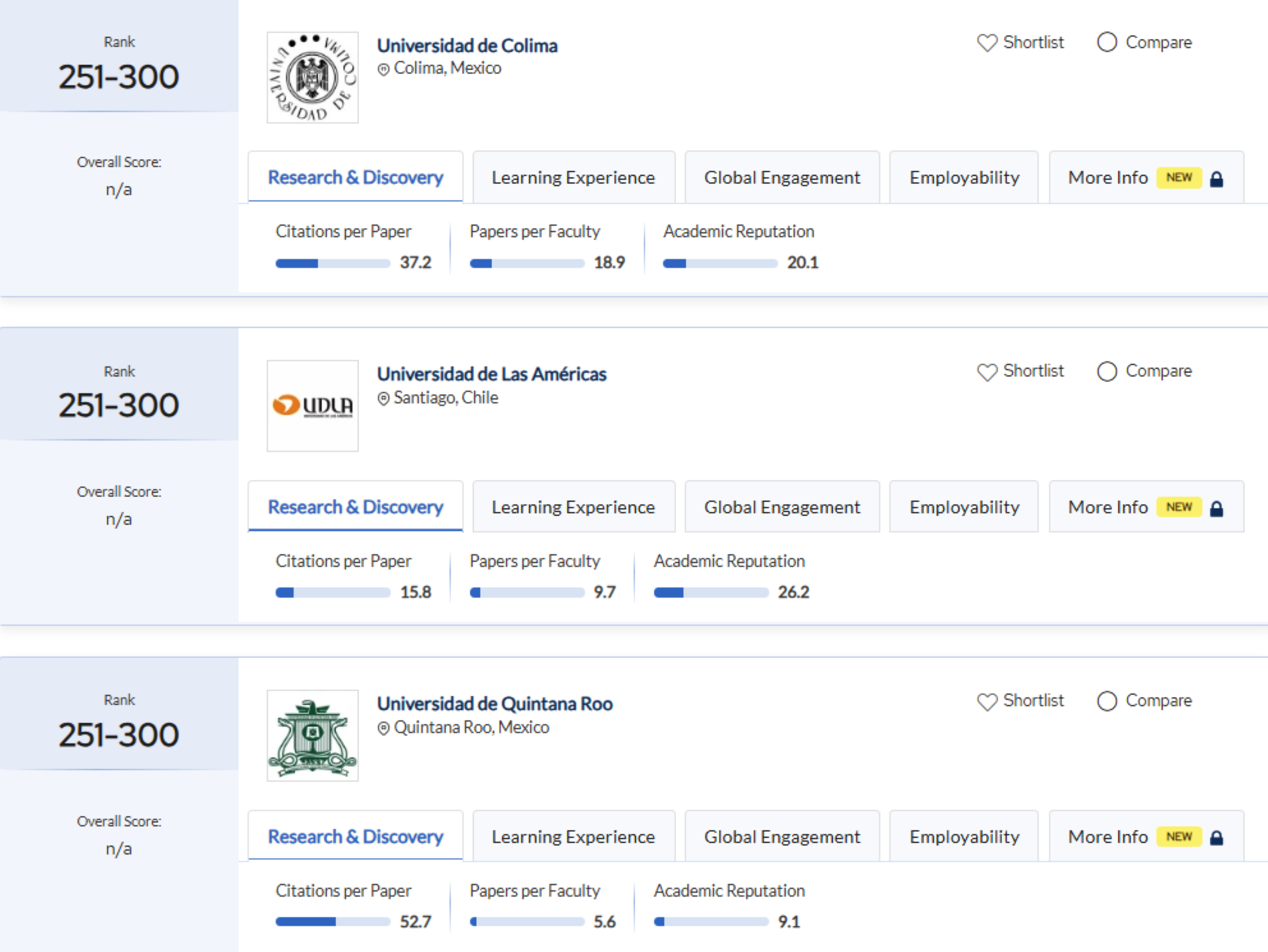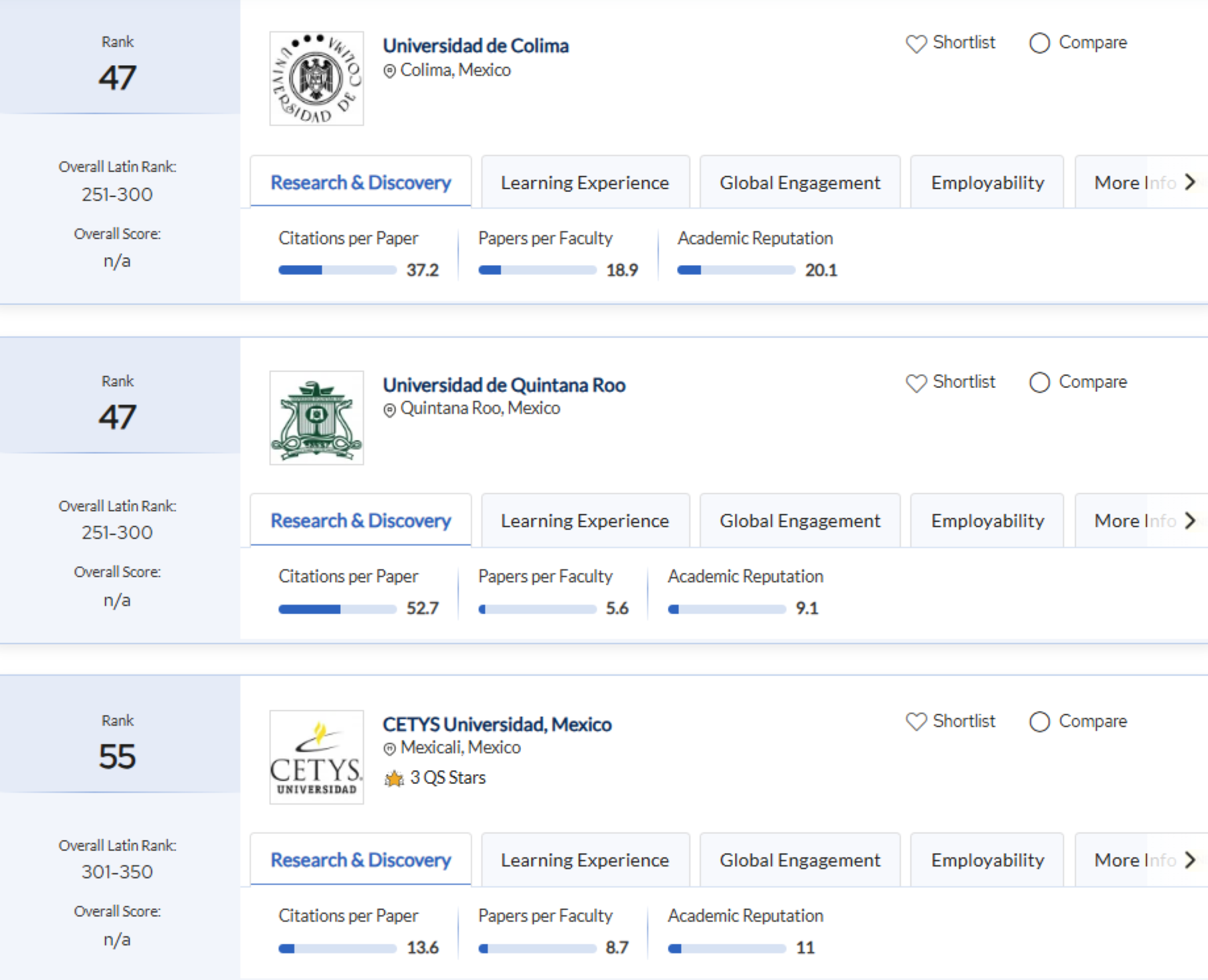 Xóchitl Trujillo señaló que este tipo de evaluaciones son una oportunidad para reflexionar sobre las estrategias institucionales en materia de docencia, investigación e impacto internacional. “Es interesante observar -dijo- qué está haciendo bien el Instituto Tecnológico y de Estudios Superiores de Monterrey (ITESM) para mantenerse como el número uno de México y América Central, y en el cuarto lugar de toda América Latina, sólo por debajo de la Pontificia Universidad Católica de Chile, que ocupa el primer puesto regional”.