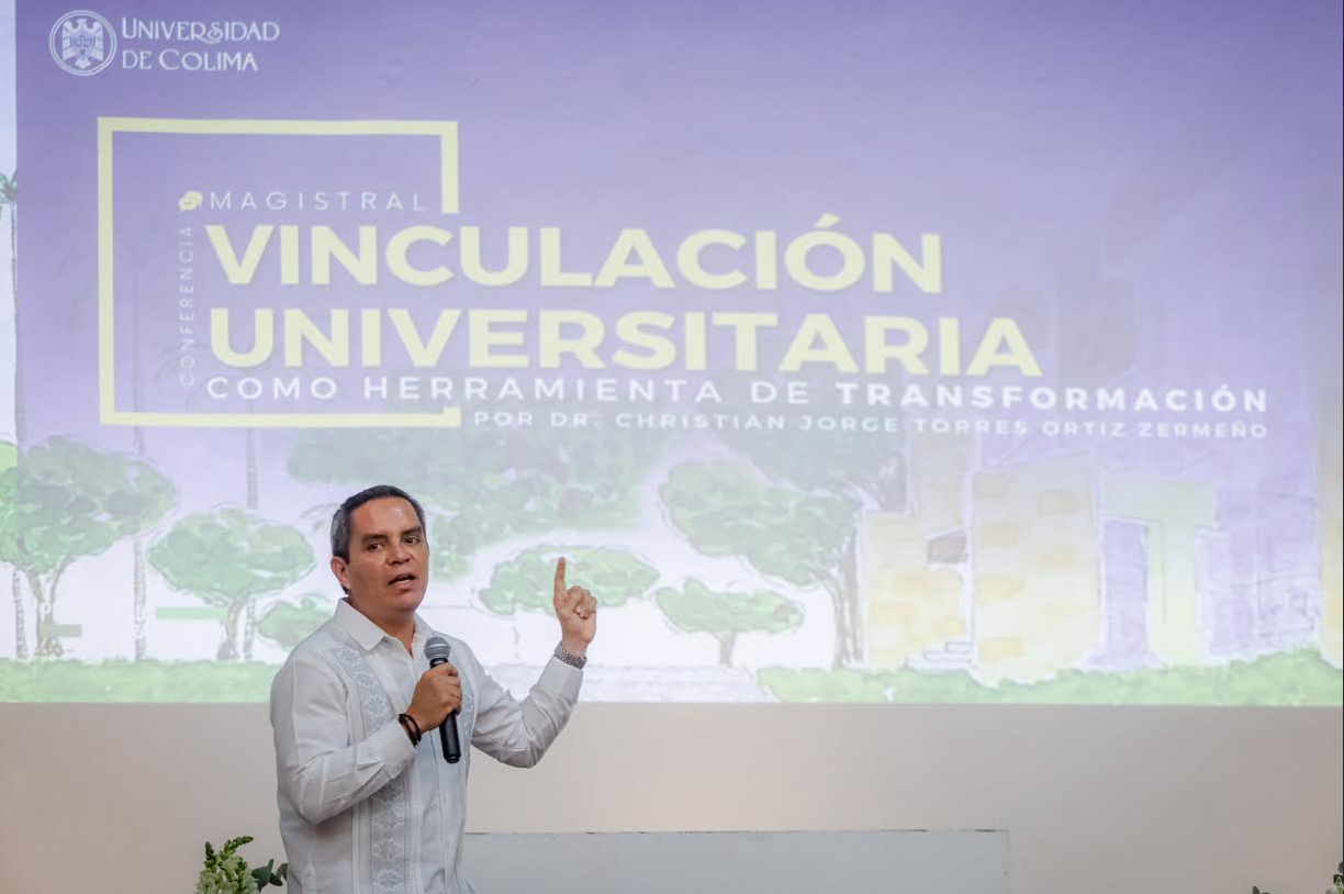 En su conferencia, Christian Torres Ortiz habló de la relevancia que tiene una coordinación de vinculación en las instituciones educativas, ya sean públicas o privadas, y cuáles fueron las estrategias y herramientas desarrolladas por la Universidad de Colima para lograr casos de éxito. También habló de los retos.