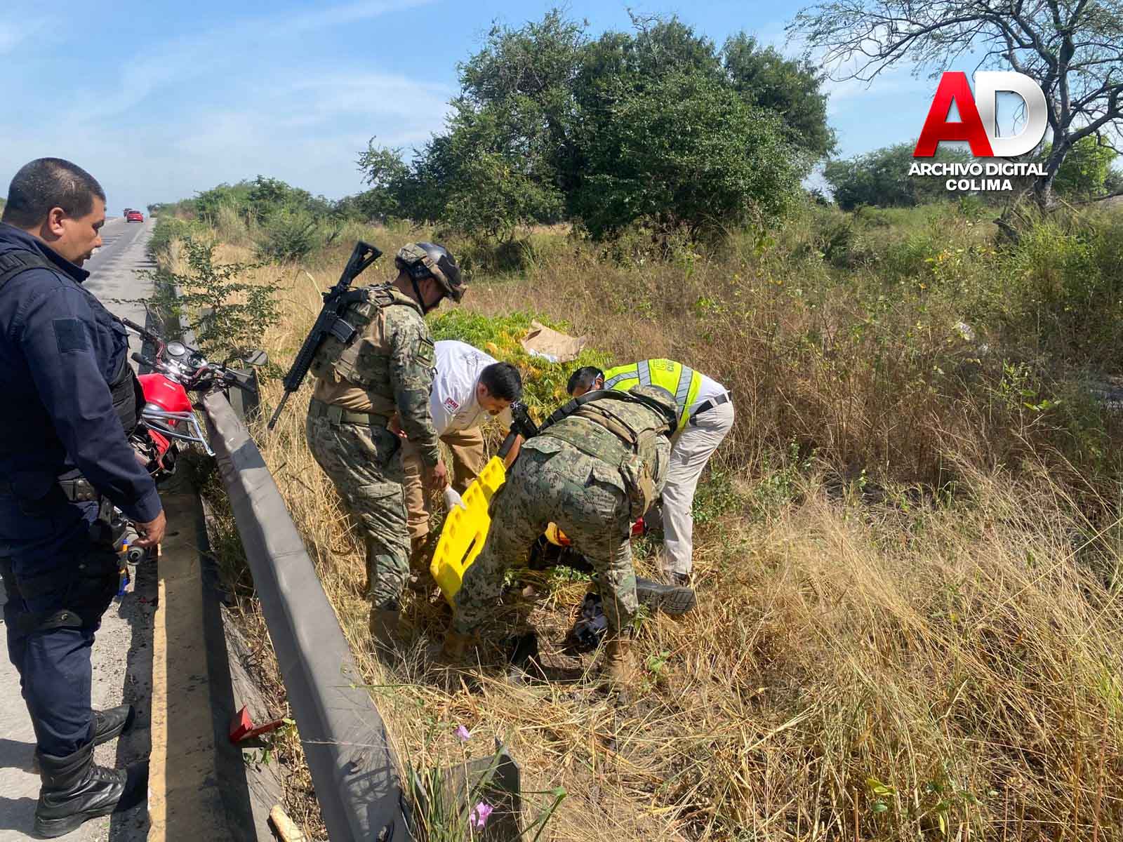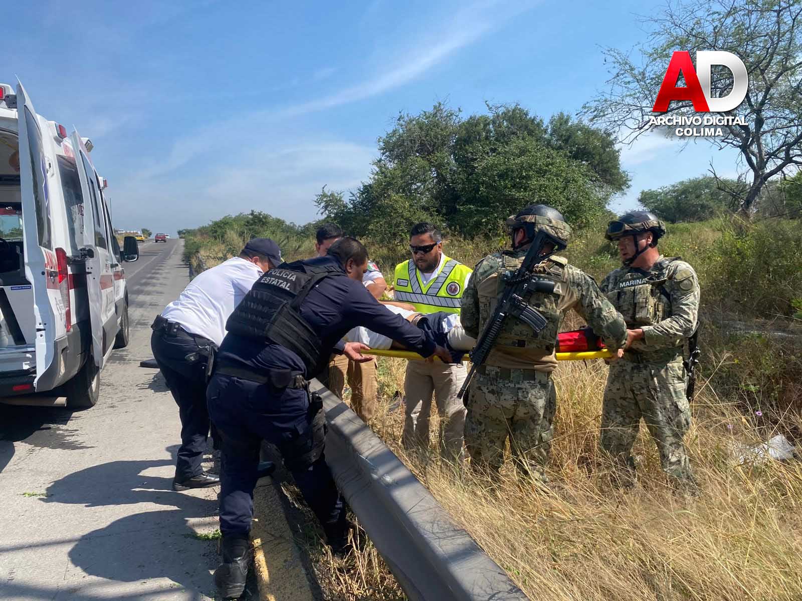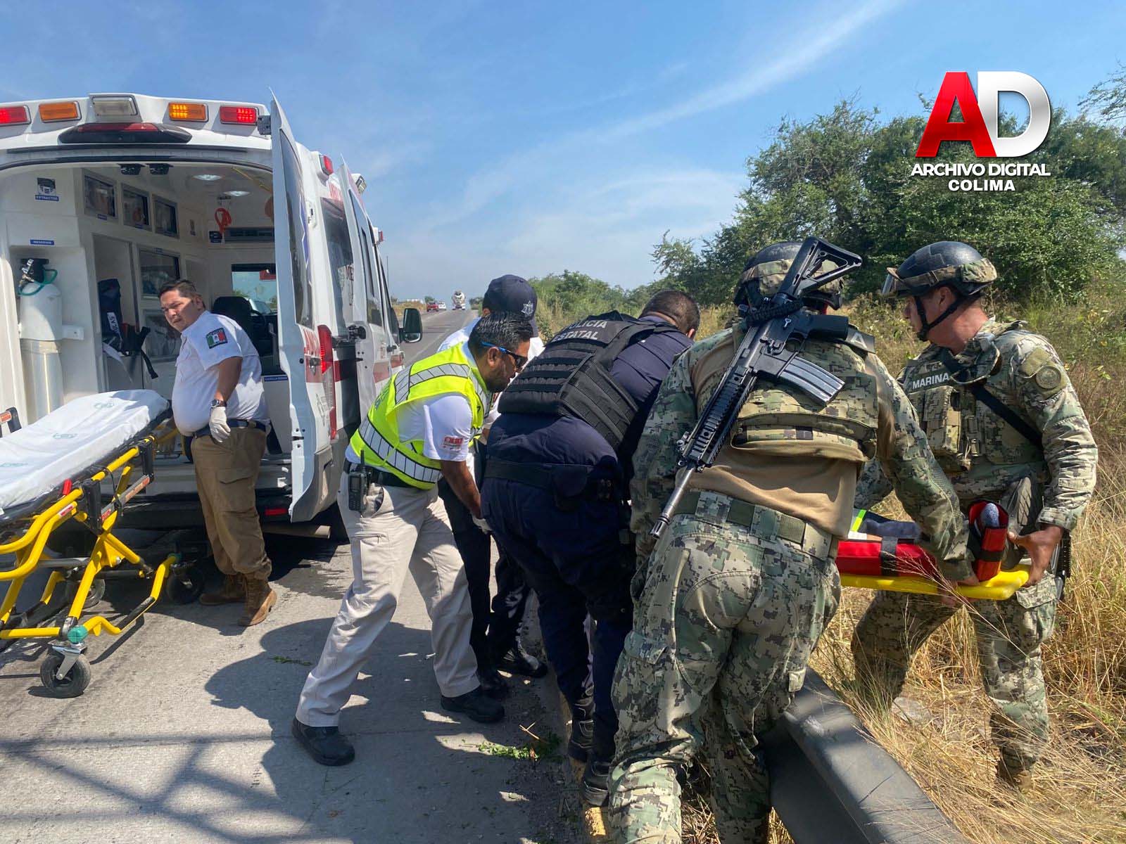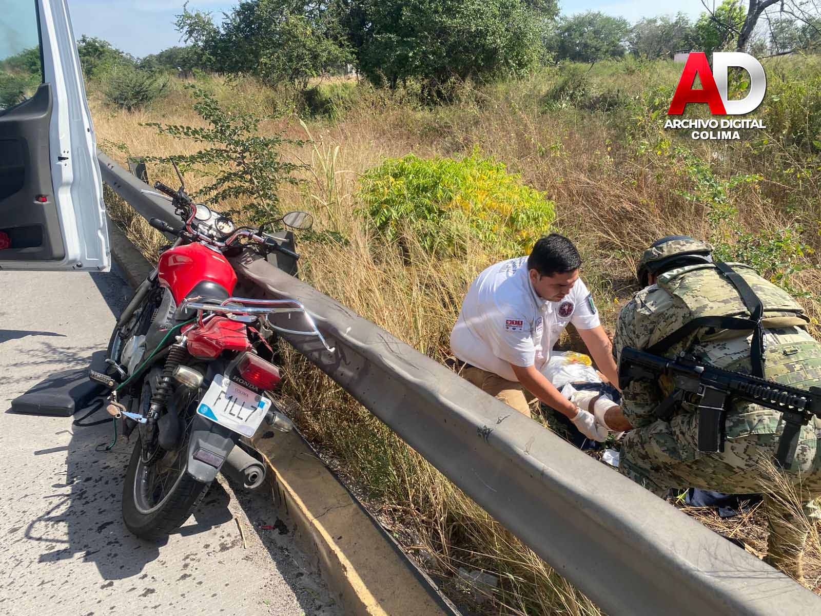 Colima, Col.— Paramédicos del Centro Regulador de Urgencias Médicas (CRUM) del Gobierno del Estado, en coordinación con elementos de la Policía Estatal y de la Secretaría de Marina-Armada de México, brindaron atención inmediata al conductor de una motocicleta que perdió el control e impactó contra el muro de contención sobre el Libramiento Ejército Mexicano, la tarde de este sábado.