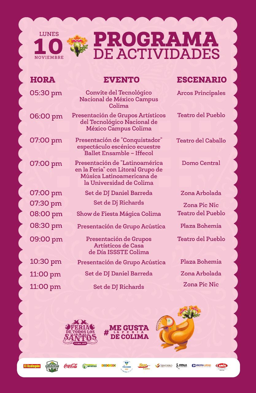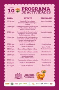 En su undécima jornada, la #FeriaDeColima ofrece una agenda llena de actividades culturales y familiares, iniciando a las 5:30 de la tarde con el convite del Instituto Tecnológico Nacional de México campus Colima, que recorrerá las diferentes áreas del recinto ferial, desde los arcos de la entrada principal hasta el Teatro del Pueblo.