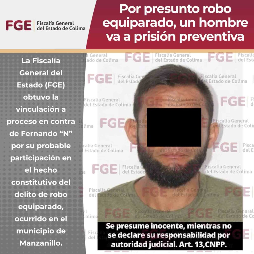 La Fiscalía General del Estado (FGE) obtuvo la vinculación a proceso en contra de Fernando “N” por su probable participación en el hecho constitutivo del delito de robo equiparado, ocurrido en el municipio de Manzanillo.
