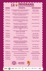 El Teatro del Pueblo presentará a las 5:30 de la tarde al Ballet Inclusivo ‘Amor y Esperanza’, seguido del grupo de bastoneras y pomponeras de Villa de Álvarez, la Academia de Baile New Steps y el espectáculo ‘Nuestra Historia’ con el Colima Ballet Folklórico, que celebra su 15º aniversario. Además, se contará con la participación de grupos artísticos del IMSS Tecomán, cerrando la jornada artística con un toque de orgullo colimense.