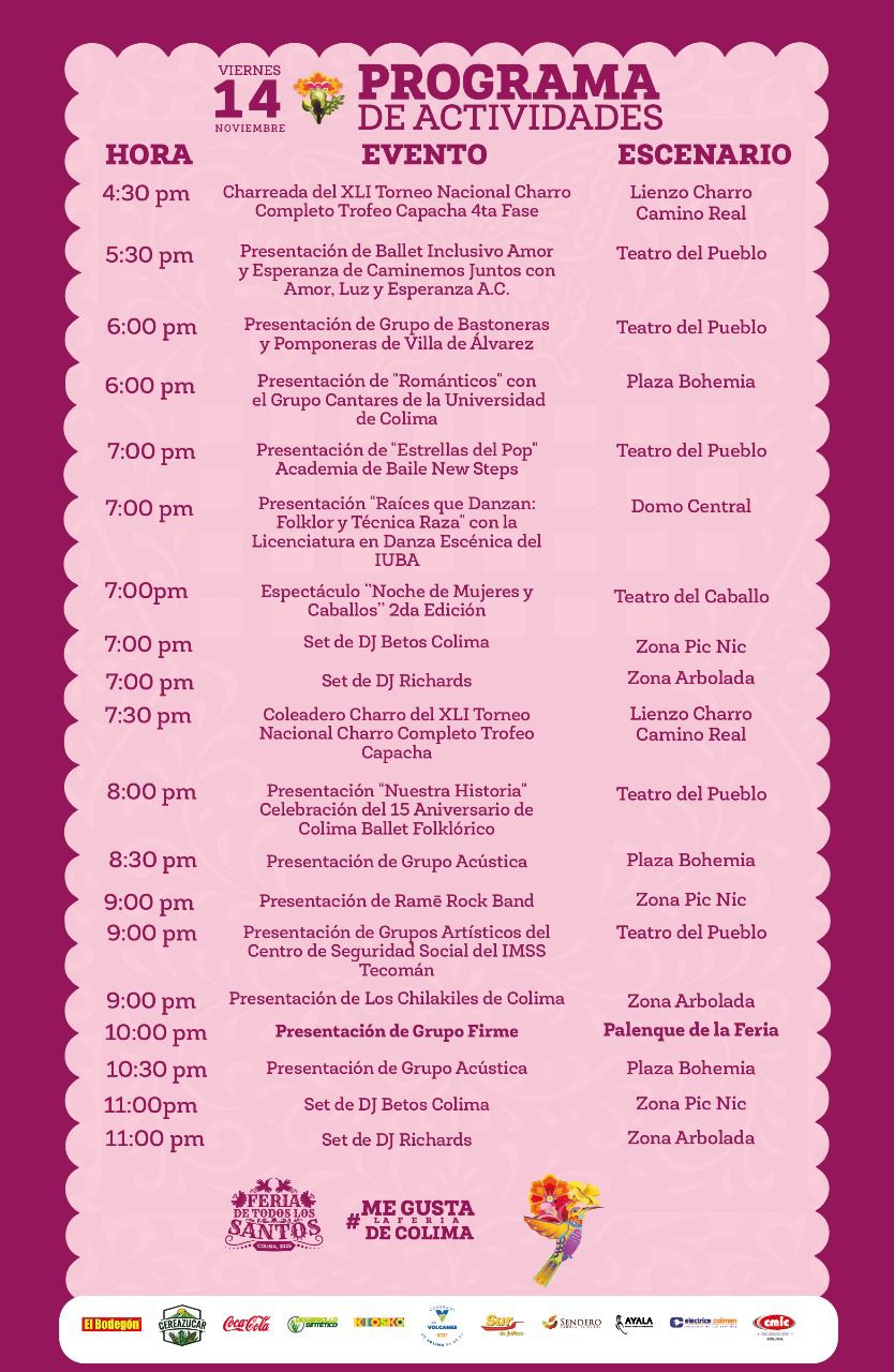 La Feria de Todos los Santos 2025 vivirá este viernes 14 de noviembre su décimo quinta jornada de talento, cultura y espectáculos para todas las familias, con una variada agenda que combina danza, música, charrería y presentaciones artísticas en los distintos escenarios del recinto ferial, dijo el director general del Instituto de Fomento de Ferias y Exposiciones (Iffecol) del Gobierno del Estado de Colima, Rodolfo Aguilar Dávalos.