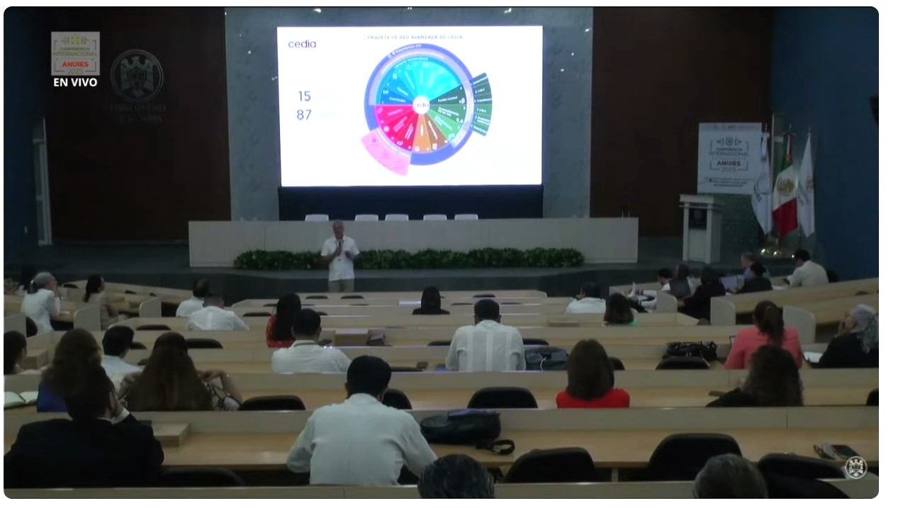 Como parte de las actividades académicas de la Conferencia Internacional ANUIES 2025, que se realizó en la Universidad de Colima del 11 al 13 de noviembre, se presentó la conferencia “Del conocimiento a la transferencia: el modelo CEDIA como catalizador de la Triple Hélice”, impartida por Juan Pablo Carvallo, director ejecutivo de CEDIA.