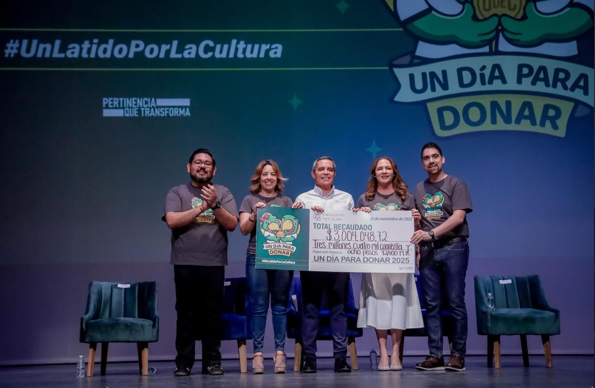 Este viernes, en un ambiente de celebración, se llevó a cabo el cierre de la campaña institucional Un día para donar, “Un latido por la cultura”, cuyo objetivo fue recaudar millón y medio de pesos del 6 de octubre al 21 de noviembre, para la construcción de un Polifórum Cultural en instalaciones del IUBA “Fue gracias a la generosidad de las y los universitarios, de empresarios y la sociedad en general, que este año no sólo alcanzamos la meta, sino que logramos duplicarla”, dijo el rector Christian Jorge Torres Ortiz Zermeño al anunciar la recaudación total, de 3 millones 4 mil 48 pesos y 72 centavos.