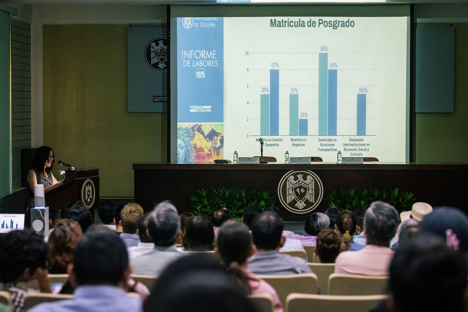 La directora de Economía mostró que entre las principales acciones que se llevaron a cabo a lo largo del año destacó la adquisición de un nuevo inmueble, lo que incrementa la infraestructura a tres edificios, así como haber logrado una matrícula histórica de 873 escolares, lo que consolida la preferencia que se tiene por estudiar en alguno de los programas que ofrece la Facultad de Economía, tanto en el nivel licenciatura como en el posgrado.