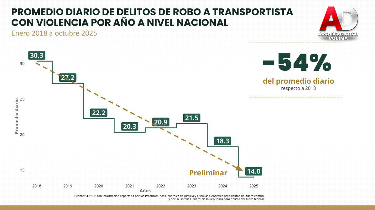 De acuerdo con datos del Secretariado Ejecutivo del Sistema Nacional de Seguridad Pública (SESNSP), en 2018 hubo un promedio diario de 30.3 robos a transportistas y para 2025, con corte al mes de octubre, se redujo más de la mitad con 14 casos diarios en promedio.