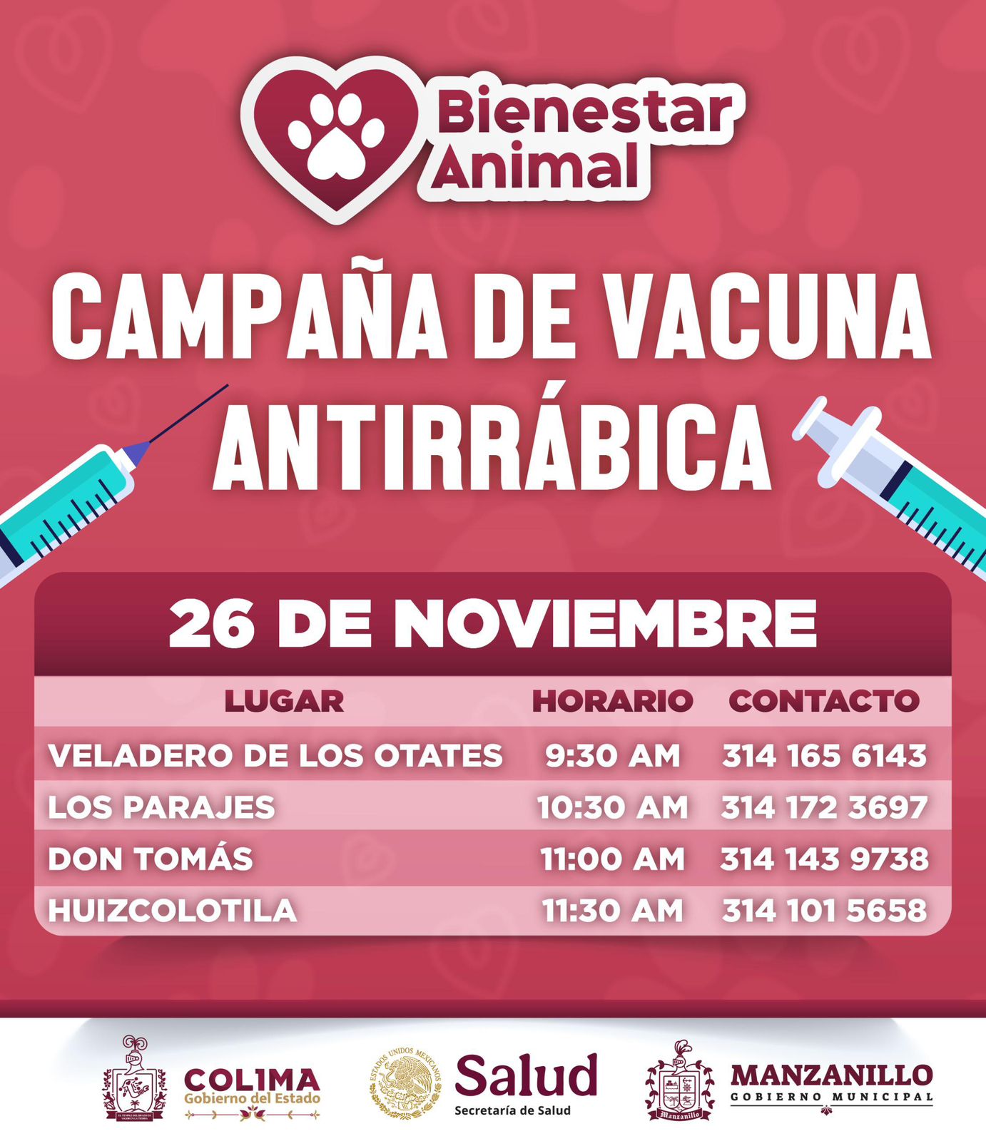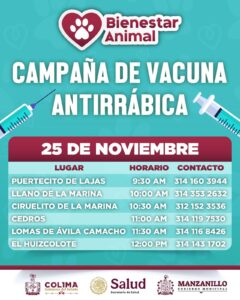 El Gobierno de Manzanillo invita a las familias a participar y contribuir al bienestar de sus mascotas, registrándose previamente en los números de contacto de cada punto de vacunación.