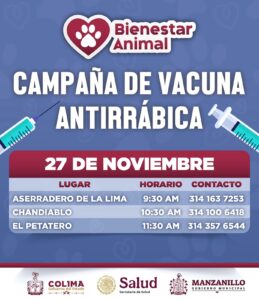 El Gobierno de Manzanillo, encabezado por la presidenta municipal Rosa María Bayardo Cabrera, continúa con la campaña gratuita de vacunación antirrábica canina y felina en diversas comunidades del municipio.
