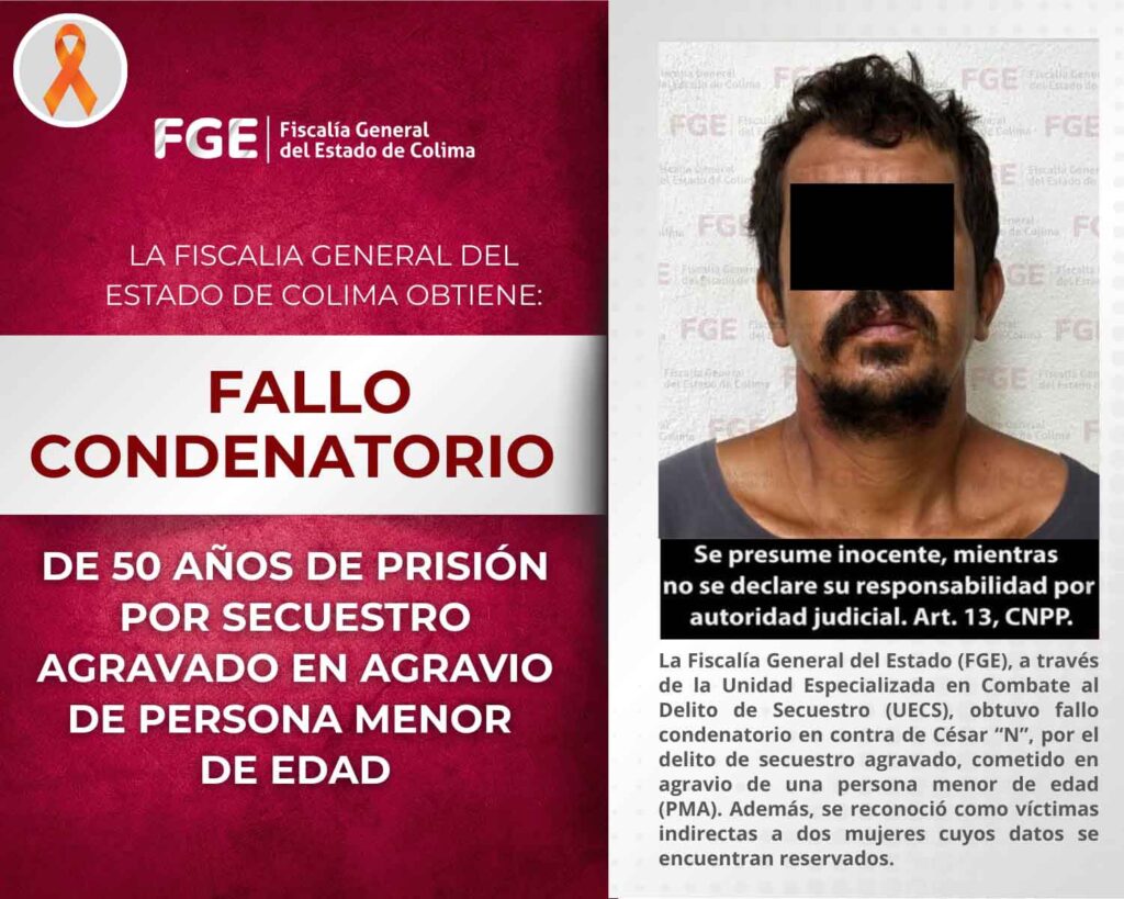 La Fiscalía General del Estado (FGE), a través de la Unidad Especializada en Combate al Delito de Secuestro (UECS), obtuvo fallo condenatorio en contra de César “N”, por el delito de secuestro agravado, cometido en agravio de una persona menor de edad (PMA). Además, se reconoció como víctimas indirectas a dos mujeres cuyos datos se encuentran reservados.