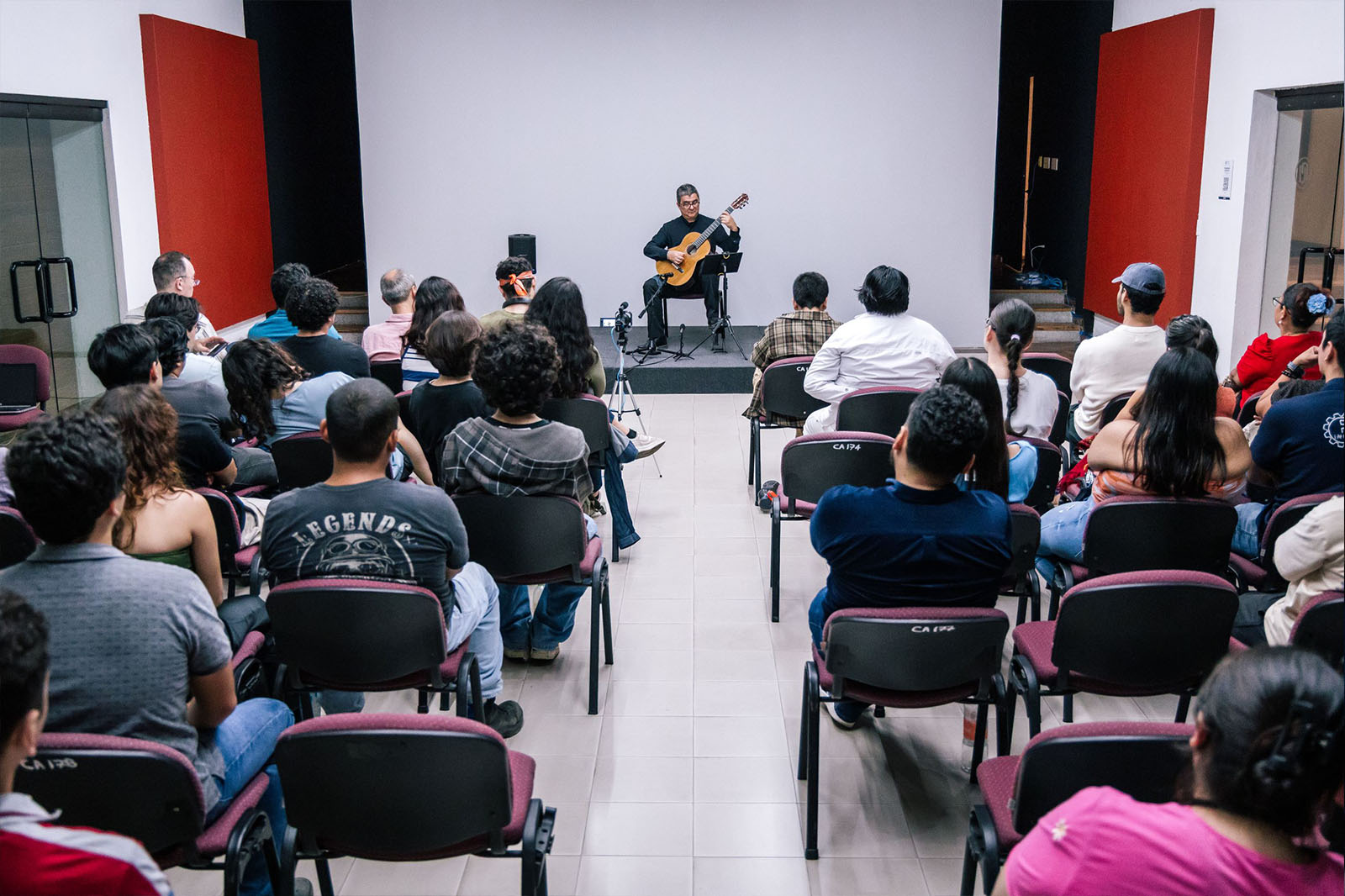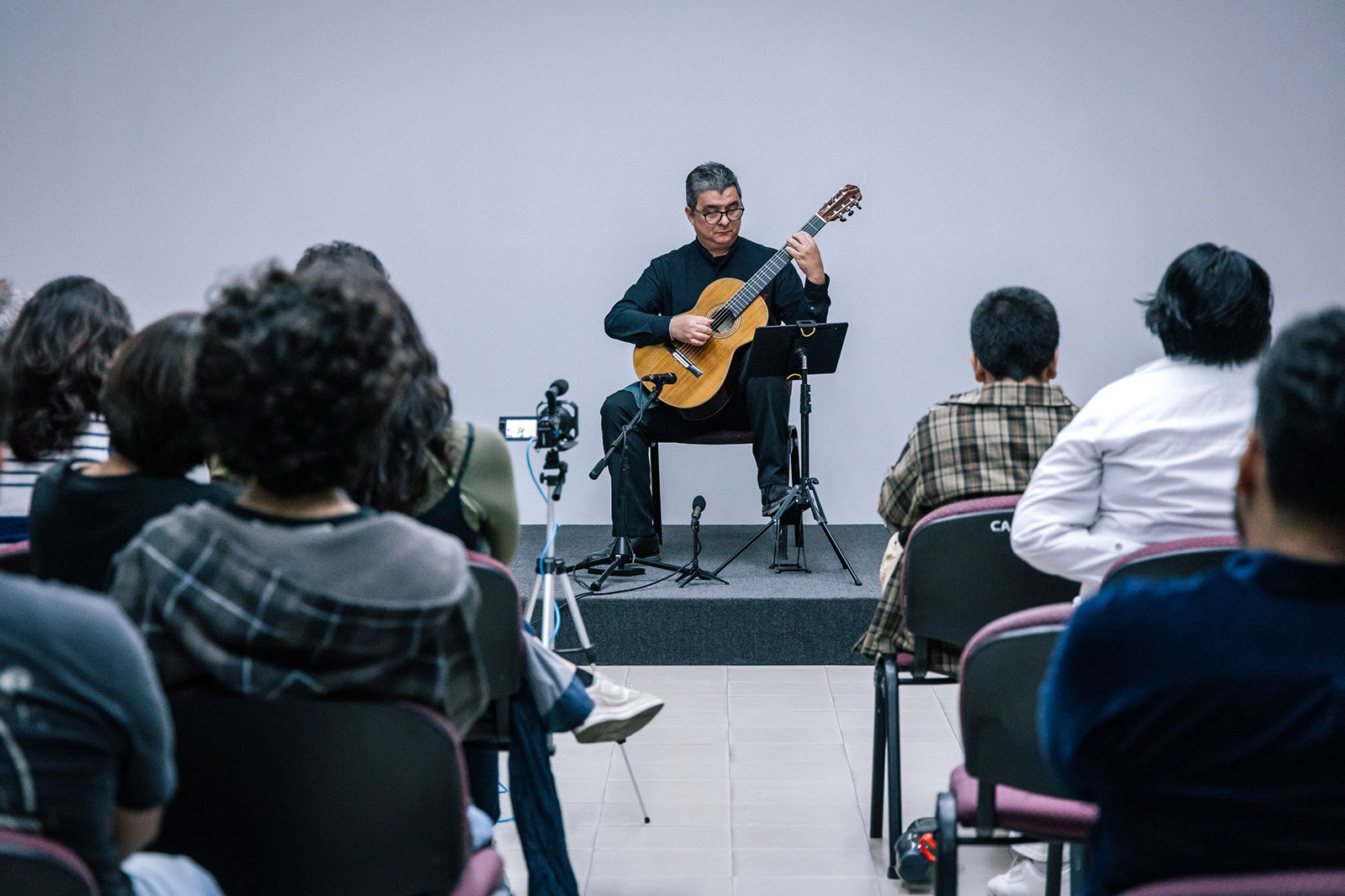 Simone Iannarelli, docente universitario y director del Encuentro Internacional de Guitarra, fue el encargado de presentar a los reconocidos guitarristas, quienes interpretaron algunas piezas del músico mexicano Manuel M. Ponce y del cubano Leo Brouwer.