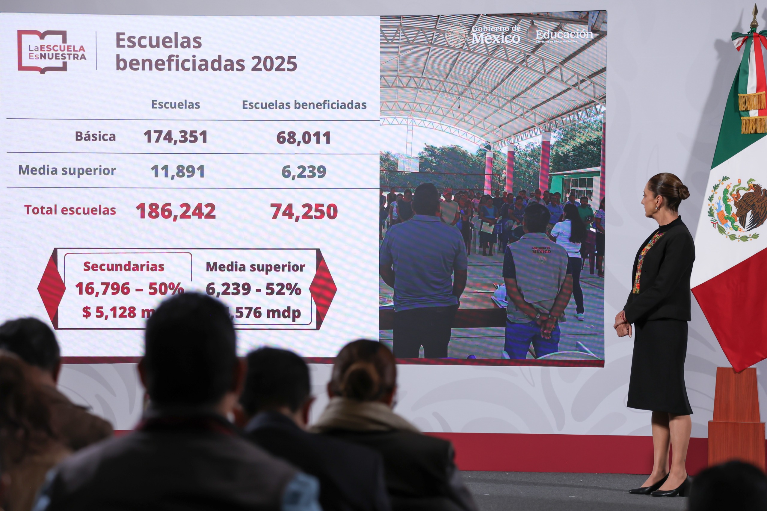 La directora general del programa La Escuela es Nuestra, Pamela López Ruiz, informó que este año se benefició a 8.1 millones de estudiantes con una inversión de 25 mil mdp que fueron entregados de forma directa a los padres y madres para la mejora de los espacios educativos de 68 mil 11 escuelas de Educación Básica de las que 16 mil 796 son secundarias públicas que recibieron 5 mil 128 mdp y 6 mil 239 escuelas de Educación Media Superior que recibieron 4 mil 576 mdp. Agregó que como parte de las acciones tras las lluvias atípicas que se presentaron en octubre, en diciembre se realizará el pago de 776 escuelas de Puebla y Veracruz con un monto de 238 mdp.