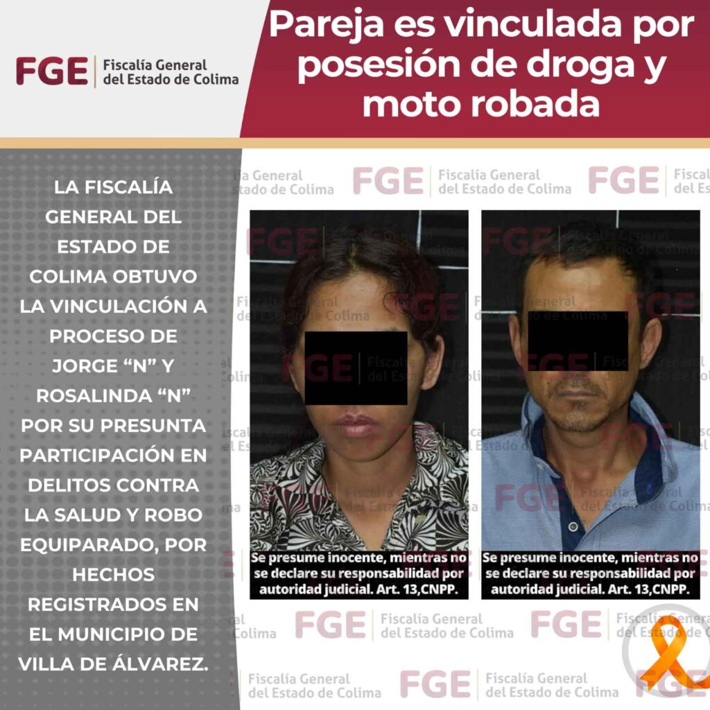La Fiscalía General del Estado de Colima obtuvo la vinculación a proceso de Jorge “N” y Rosalinda “N” por su presunta participación en delitos contra la salud y robo equiparado, por hechos registrados en el municipio de Villa de Álvarez.