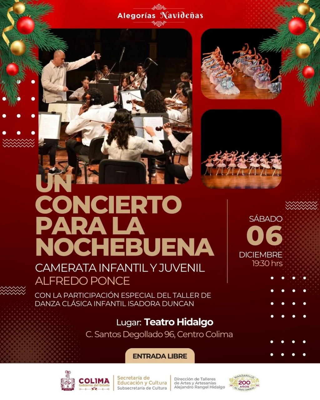 La Subsecretaría de Cultura del Gobierno del Estado de Colima invita a toda la población a la temporada de Conciertos Navideños 2025 en el Teatro Hidalgo en el centro histórico de la capital colimense, cartelera que ofrecerá tres presentaciones musicales gratuitas desde el 6 al 16 de diciembre.