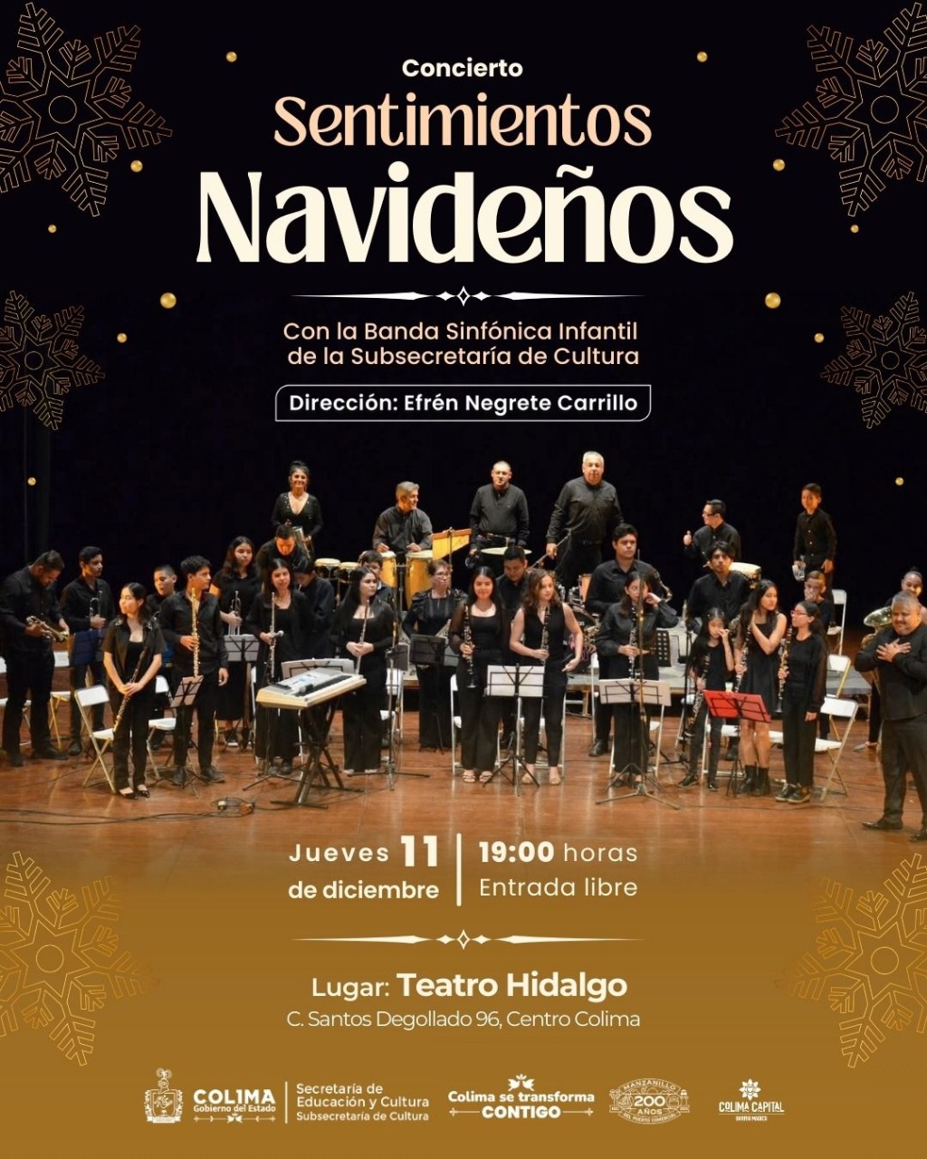 Posteriormente, el jueves 11 de diciembre, también a las 19:00 horas, la Banda Sinfónica Infantil y Juvenil de la Subsecretaría de Cultura, bajo la dirección de Efrén Negrete Carrillo, ofrecerá el concierto Sentimientos Navideños, repertorio compuesto por clásicos contemporáneos alusivos a las festividades de fin de año.