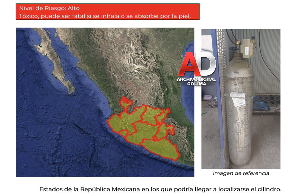 La alerta no solo abarca al estado de Colima, sino que se extiende a Jalisco, Guanajuato, Querétaro, Estado de México y Guerrero, entidades donde podría localizarse el cilindro sustraído, por lo que se pide máxima precaución a la población.