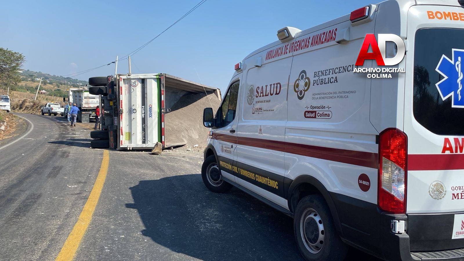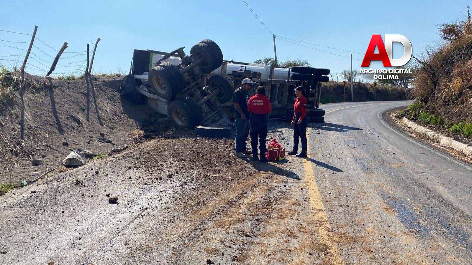 Elementos de Protección Civil y Bomberos del municipio de Cuauhtémoc atendieron el reporte de un accidente registrado sobre la carretera libre Quesería–Tonila, donde un tráiler con góndola se volcó.