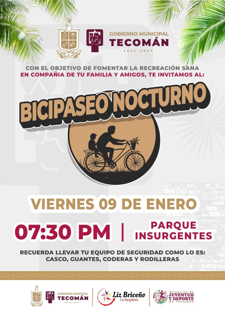 El presidente municipal de Tecomán, Armando Reyna, en coordinación con la regidora Liz Briceño, invita a todas las familias tecomenses a participar en el Bicipaseo Familiar Nocturno este próximo viernes 09 de enero.