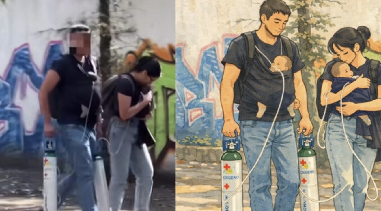 De acuerdo con el testimonio difundido en plataformas digitales, la madre llevaba a uno de los pequeños en brazos, cuidándolo con extrema atención, mientras que el padre cargaba al otro bebé dentro de su playera, a la altura del pecho. Esta forma de llevarlo le permitía mantener las manos libres para transportar los dos tanques de oxígeno indispensables para la salud de sus hijos.