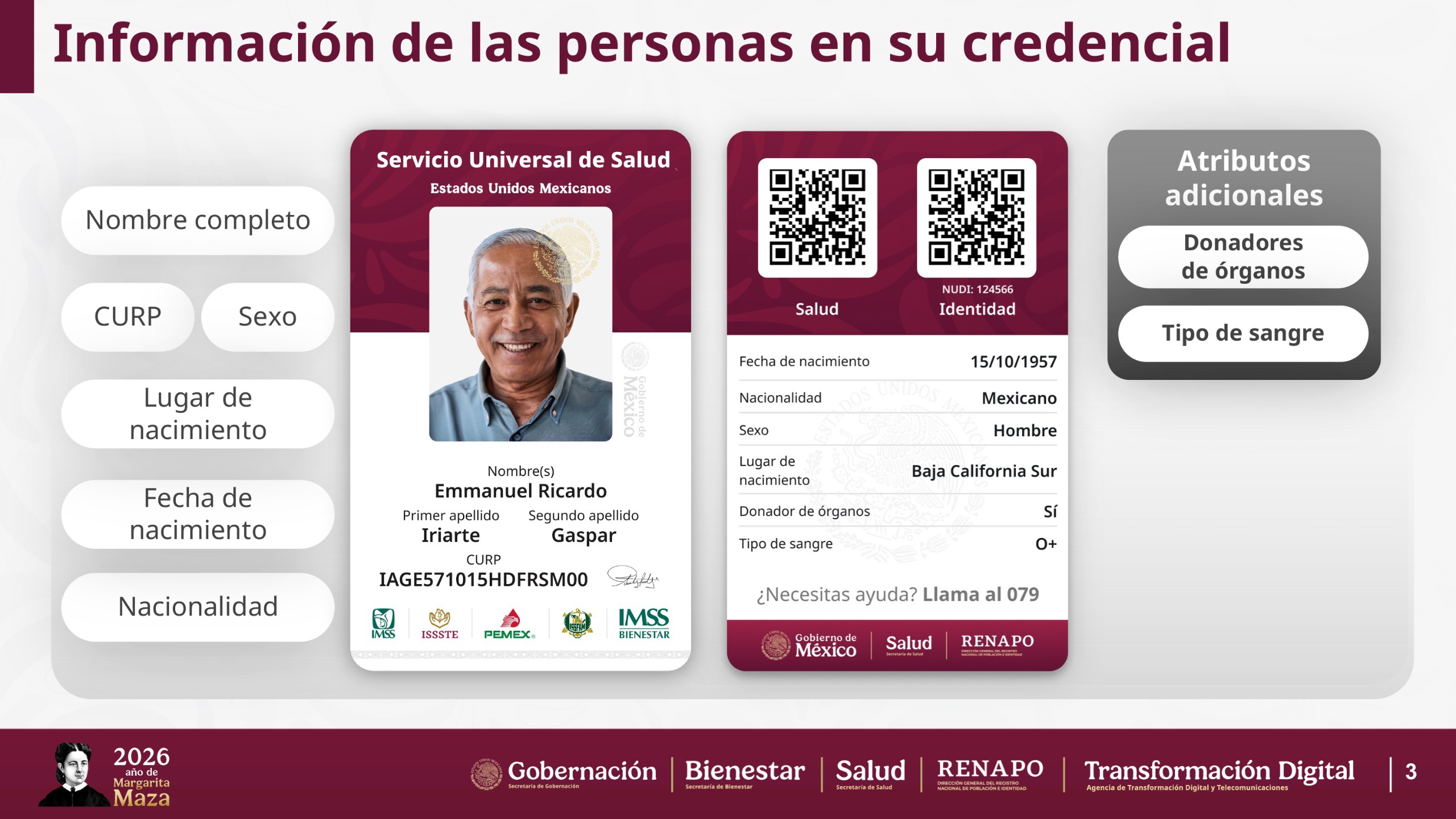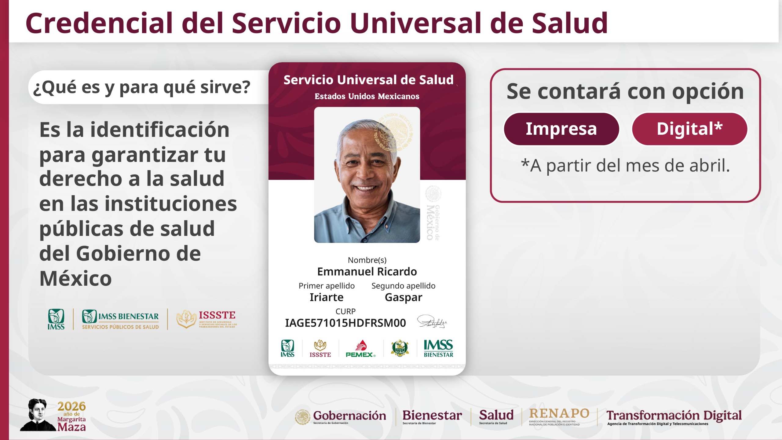 La funcionaria federal indicó que la Credencial del Servicio Universal de Salud es para todas las personas, desde las más pequeñas hasta las más grandes, se realizará por orden alfabético, y sólo a las y los menores de edad podrán registrarlos la madre, el padre o el tutor.