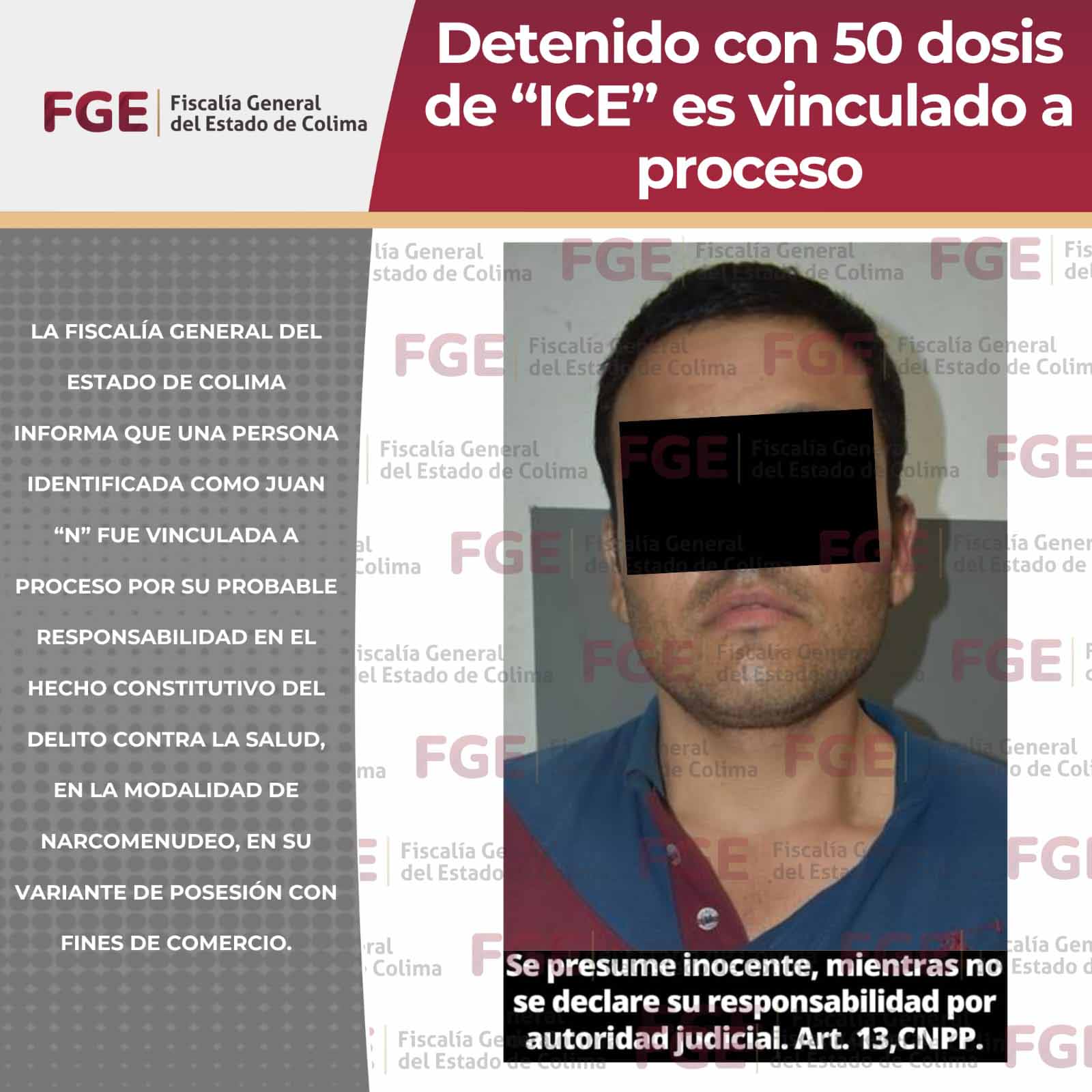 La Fiscalía General del Estado de Colima informa que una persona identificada como Juan “N” fue vinculada a proceso por su probable responsabilidad en el hecho constitutivo del delito contra la salud, en la modalidad de narcomenudeo, en su variante de posesión con fines de comercio.